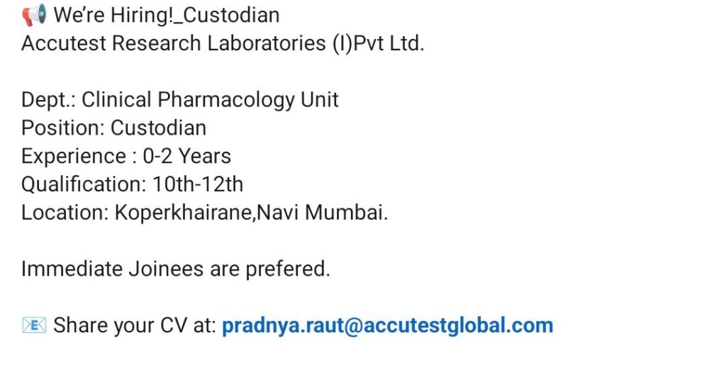 HomeHomeCustodian Job Vacancy | Accutest Clinical Pharmacology Unit | Navi Mumbai – 0-2 Years Exp Custodian Job Vacancy | Accutest Clinical Pharmacology Unit | Navi Mumbai – 0-2 Years Exp chandrakanth April 8, 2026 Post Views: 1 Related posts: SSterling Hospitals Hiring 2025 | Medical Officer, Staff Nurse & Assistant Manager Jobs AP కాంట్రాక్ట్ / అవుట్సోర్సింగ్ ఉద్యోగాలు 2025 | RMC Jobs Recruitment 2025 | అర్హత & దరఖాస్తు వివరాలు Sai Life Sciences Walk-In Interview 2026 | Analytical R&D (API) Jobs – Hyderabad Fresher Walk-in Interviews in Daman: B.Pharm, M.Sc, ITI, Diploma | USV Pharma Jobs – 18 Jan 2026 Share Pinterest Tweet Email Linkedin Whatsapp Telegram Prev Article Next Article Leave a Reply Cancel Reply Save my name, email, and website in this browser for the next time I comment.