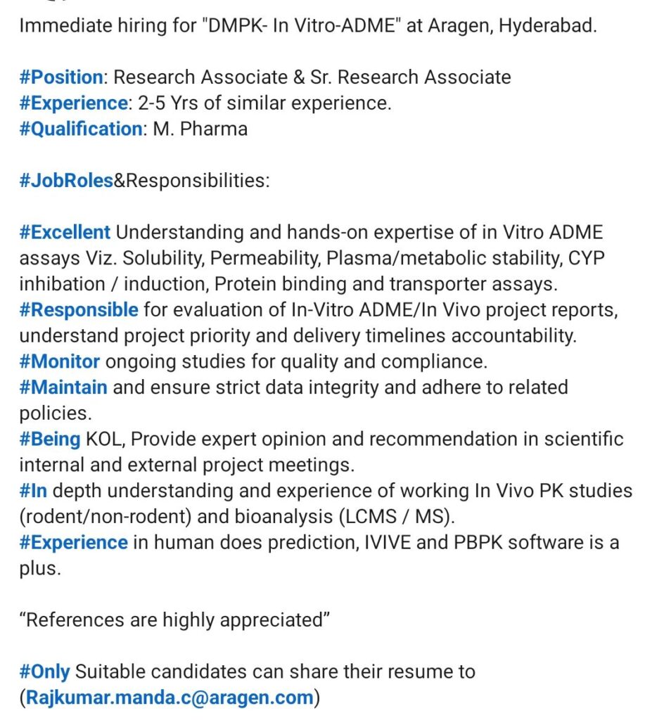 HomeHomeDMPK In Vitro ADME Job | Research Associate | Aragen Hyderabad | M.Pharma Required DMPK In Vitro ADME Job | Research Associate | Aragen Hyderabad | M.Pharma Required chandrakanth April 4, 2026 Post Views: 3 Related posts: SSterling Hospitals Hiring 2025 | Medical Officer, Staff Nurse & Assistant Manager Jobs AP కాంట్రాక్ట్ / అవుట్సోర్సింగ్ ఉద్యోగాలు 2025 | RMC Jobs Recruitment 2025 | అర్హత & దరఖాస్తు వివరాలు Sai Life Sciences Walk-In Interview 2026 | Analytical R&D (API) Jobs – Hyderabad Fresher Walk-in Interviews in Daman: B.Pharm, M.Sc, ITI, Diploma | USV Pharma Jobs – 18 Jan 2026 Share Pinterest Tweet Email Linkedin Whatsapp Telegram Prev Article Next Article Leave a Reply Cancel Reply Save my name, email, and website in this browser for the next time I comment.