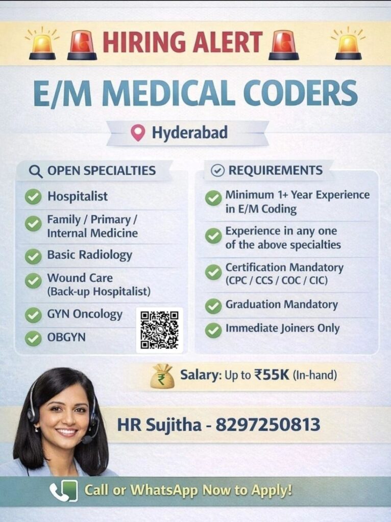 • E/M Medical Coder (Hospitalist, Radiology, OBGYN, etc.) – Hyderabad – 1+ Year Exp, CPC/CCS/COC/CIC – Up to ₹55K In-Hand