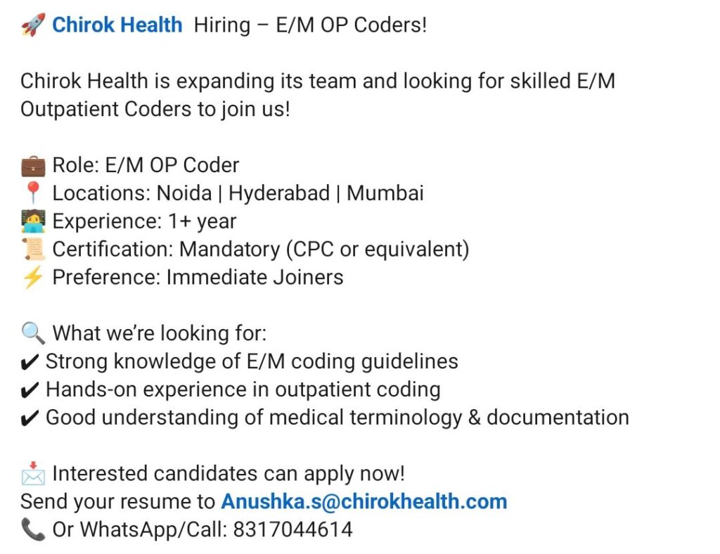 HomeHomeE/M OP Coding Jobs 2026 – Chirok Health Hiring Certified Coders (CPC) – Noida, Hyderabad, Mumbai – 1+ Year Exp – Immediate Joiners E/M OP Coding Jobs 2026 – Chirok Health Hiring Certified Coders (CPC) – Noida, Hyderabad, Mumbai – 1+ Year Exp – Immediate Joiners chandrakanth April 5, 2026 Post Views: 5 Related posts: SSterling Hospitals Hiring 2025 | Medical Officer, Staff Nurse & Assistant Manager Jobs AP కాంట్రాక్ట్ / అవుట్సోర్సింగ్ ఉద్యోగాలు 2025 | RMC Jobs Recruitment 2025 | అర్హత & దరఖాస్తు వివరాలు Sai Life Sciences Walk-In Interview 2026 | Analytical R&D (API) Jobs – Hyderabad Fresher Walk-in Interviews in Daman: B.Pharm, M.Sc, ITI, Diploma | USV Pharma Jobs – 18 Jan 2026 Share Pinterest Tweet Email Linkedin Whatsapp Telegram Prev Article Next Article Leave a Reply Cancel Reply Save my name, email, and website in this browser for the next time I comment.