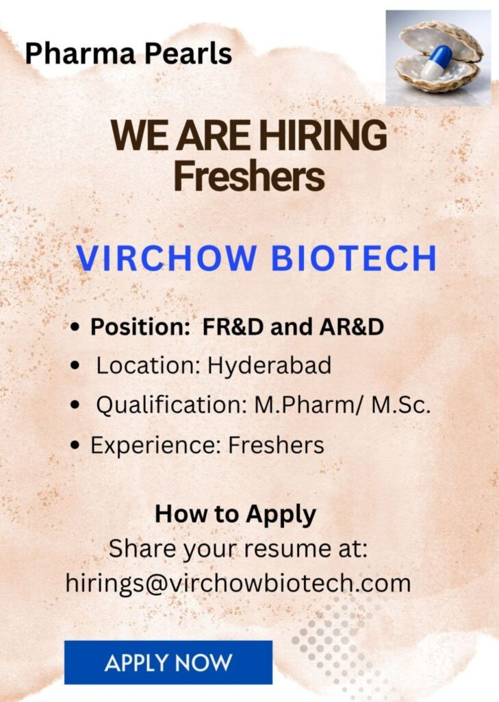 HomeHomeFR&D and AR&D (Freshers) – Virchow Biotech (Hyderabad) – M.Pharm / M.Sc – Apply Now FR&D and AR&D (Freshers) – Virchow Biotech (Hyderabad) – M.Pharm / M.Sc – Apply Now chandrakanth April 16, 2026 Post Views: 6 Related posts: Walk-in Interview for Fresher Organic Trainee (M.Sc Organic Chemistry) at Sharmista Research Centre, Ahmedabad – 21st February 2026 Neuland Labs Walk-in Interview 2026: Production & QC Chemist/Officer | Daund (Maharashtra) | March 6-7 Medical Coder (HCC) Jobs – Work From Home – CRC/CPC Certified | Omega Healthcare Medical Coding Team Lead Job in Chennai | E&M / IP / OP | CPC Certified | Work from Office Share Pinterest Tweet Email Linkedin Whatsapp Telegram Prev Article Next Article Leave a Reply Cancel Reply Save my name, email, and website in this browser for the next time I comment.