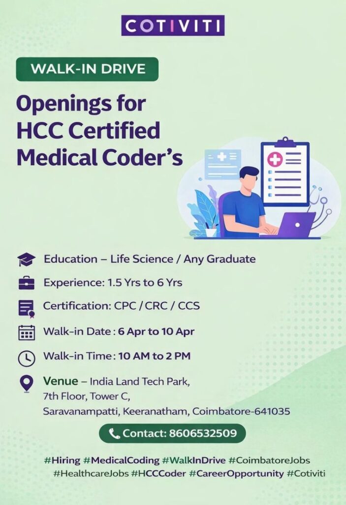 HomeHomeHCC Certified Medical Coder Walk-In Drive | Cotiviti Coimbatore | Apr 6–10 HCC Certified Medical Coder Walk-In Drive | Cotiviti Coimbatore | Apr 6–10 chandrakanth April 4, 2026 Post Views: 3 Related posts: SSterling Hospitals Hiring 2025 | Medical Officer, Staff Nurse & Assistant Manager Jobs AP కాంట్రాక్ట్ / అవుట్సోర్సింగ్ ఉద్యోగాలు 2025 | RMC Jobs Recruitment 2025 | అర్హత & దరఖాస్తు వివరాలు Sai Life Sciences Walk-In Interview 2026 | Analytical R&D (API) Jobs – Hyderabad Fresher Walk-in Interviews in Daman: B.Pharm, M.Sc, ITI, Diploma | USV Pharma Jobs – 18 Jan 2026 Share Pinterest Tweet Email Linkedin Whatsapp Telegram Prev Article Next Article Leave a Reply Cancel Reply Save my name, email, and website in this browser for the next time I comment.