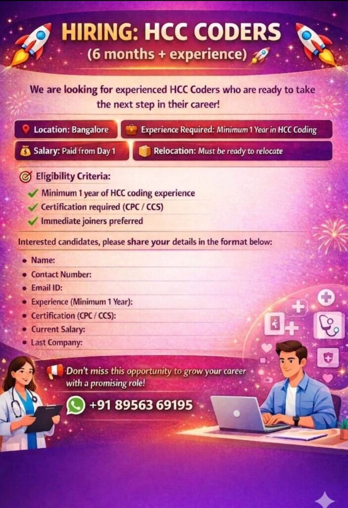 HCC Coder (1+ Year Exp, CPC/CCS) – Bangalore – Paid from Day 1 – Immediate Joiners – Relocation Required