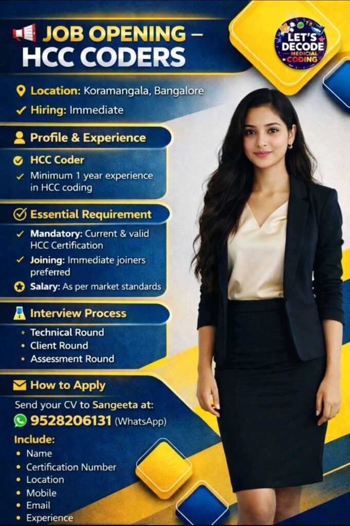 HomeHomeHCC Coder (1+ Year Exp) – Koramangala, Bangalore – Immediate Joiner – Valid HCC Certification Required HCC Coder (1+ Year Exp) – Koramangala, Bangalore – Immediate Joiner – Valid HCC Certification Required chandrakanth April 16, 2026 Post Views: 1 Related posts: SSterling Hospitals Hiring 2025 | Medical Officer, Staff Nurse & Assistant Manager Jobs AP కాంట్రాక్ట్ / అవుట్సోర్సింగ్ ఉద్యోగాలు 2025 | RMC Jobs Recruitment 2025 | అర్హత & దరఖాస్తు వివరాలు Sai Life Sciences Walk-In Interview 2026 | Analytical R&D (API) Jobs – Hyderabad Fresher Walk-in Interviews in Daman: B.Pharm, M.Sc, ITI, Diploma | USV Pharma Jobs – 18 Jan 2026 Share Pinterest Tweet Email Linkedin Whatsapp Telegram Prev Article Next Article Leave a Reply Cancel Reply Save my name, email, and website in this browser for the next time I comment.