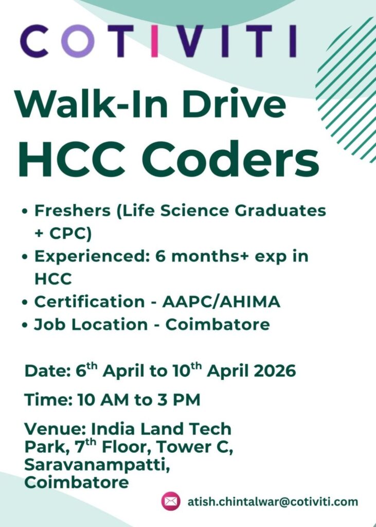 HomeHomeHCC Coders Walk-In Drive – Coimbatore | Freshers (Life Science + CPC) & Experienced | Cotiviti | April 6-10, 2026 HCC Coders Walk-In Drive – Coimbatore | Freshers (Life Science + CPC) & Experienced | Cotiviti | April 6-10, 2026 chandrakanth April 2, 2026 Post Views: 3 Related posts: SSterling Hospitals Hiring 2025 | Medical Officer, Staff Nurse & Assistant Manager Jobs AP కాంట్రాక్ట్ / అవుట్సోర్సింగ్ ఉద్యోగాలు 2025 | RMC Jobs Recruitment 2025 | అర్హత & దరఖాస్తు వివరాలు Sai Life Sciences Walk-In Interview 2026 | Analytical R&D (API) Jobs – Hyderabad Fresher Walk-in Interviews in Daman: B.Pharm, M.Sc, ITI, Diploma | USV Pharma Jobs – 18 Jan 2026 Share Pinterest Tweet Email Linkedin Whatsapp Telegram Prev Article Next Article Leave a Reply Cancel Reply Save my name, email, and website in this browser for the next time I comment.