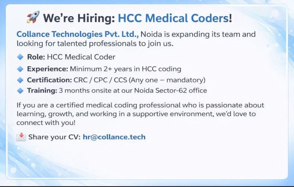 HomeHomeHCC Medical Coder – Collance Technologies (Noida) – 2+ Yrs Exp, CRC/CPC/CCS Mandatory – 3 Months Onsite Training HCC Medical Coder – Collance Technologies (Noida) – 2+ Yrs Exp, CRC/CPC/CCS Mandatory – 3 Months Onsite Training chandrakanth April 11, 2026 Post Views: 1 Related posts: Hiring Home Health Coding Experts: Team Lead, QA & Coder | Mumbai, Hyderabad, Chennai | Up to ₹15 LPA Patient Calling RCM Jobs in Chennai – Night Shift | 1–3 Years Experience | Immediate Joining HR Executive Job in Chennai & Madurai | Zaitoon Restaurants | ₹25k–₹30k | Hiring Now Remote Medical Coder – Freshers & Experienced – Trispect Health Medics (WFH, Night Shift, Training Provided) Share Pinterest Tweet Email Linkedin Whatsapp Telegram Prev Article Next Article Leave a Reply Cancel Reply Save my name, email, and website in this browser for the next time I comment.