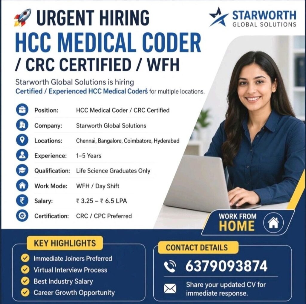 HomeHomeHCC Medical Coder (CRC/CPC Certified) – Starworth Global Solutions – Remote (WFH) – 1–5 Years Exp – ₹3.25–6.5 LPA – Day Shift HCC Medical Coder (CRC/CPC Certified) – Starworth Global Solutions – Remote (WFH) – 1–5 Years Exp – ₹3.25–6.5 LPA – Day Shift chandrakanth April 26, 2026 Post Views: 3 Related posts: SSterling Hospitals Hiring 2025 | Medical Officer, Staff Nurse & Assistant Manager Jobs AP కాంట్రాక్ట్ / అవుట్సోర్సింగ్ ఉద్యోగాలు 2025 | RMC Jobs Recruitment 2025 | అర్హత & దరఖాస్తు వివరాలు Sai Life Sciences Walk-In Interview 2026 | Analytical R&D (API) Jobs – Hyderabad Fresher Walk-in Interviews in Daman: B.Pharm, M.Sc, ITI, Diploma | USV Pharma Jobs – 18 Jan 2026 Share Pinterest Tweet Email Linkedin Whatsapp Telegram Prev Article Next Article Leave a Reply Cancel Reply Save my name, email, and website in this browser for the next time I comment.