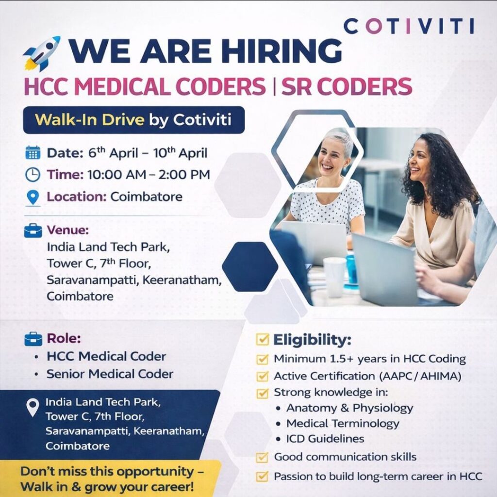 HomeHomeHCC Medical Coder Walk-In Drive 2026 – Cotiviti Coimbatore (Apr 6–10) HCC Medical Coder Walk-In Drive 2026 – Cotiviti Coimbatore (Apr 6–10) chandrakanth April 5, 2026 Post Views: 2 Related posts: SSterling Hospitals Hiring 2025 | Medical Officer, Staff Nurse & Assistant Manager Jobs AP కాంట్రాక్ట్ / అవుట్సోర్సింగ్ ఉద్యోగాలు 2025 | RMC Jobs Recruitment 2025 | అర్హత & దరఖాస్తు వివరాలు Sai Life Sciences Walk-In Interview 2026 | Analytical R&D (API) Jobs – Hyderabad Fresher Walk-in Interviews in Daman: B.Pharm, M.Sc, ITI, Diploma | USV Pharma Jobs – 18 Jan 2026 Share Pinterest Tweet Email Linkedin Whatsapp Telegram Prev Article Next Article Leave a Reply Cancel Reply Save my name, email, and website in this browser for the next time I comment.