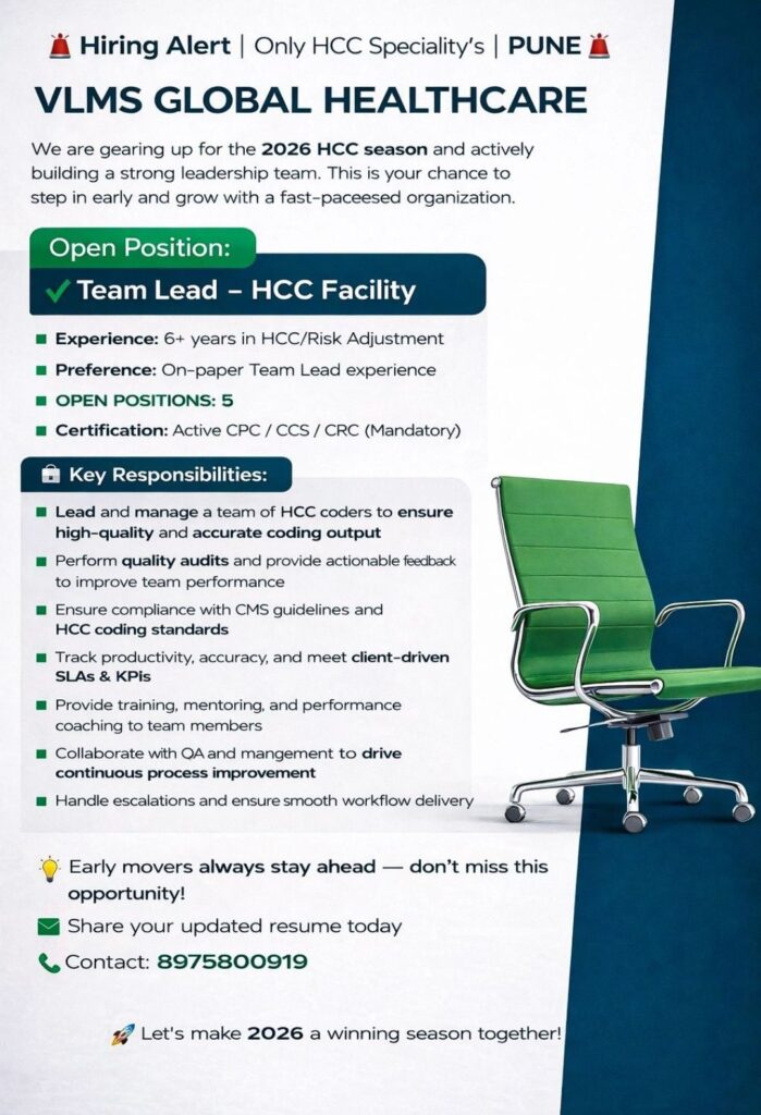 HomeHomeHCC Team Lead – VLMS Global Healthcare (Pune) – 6+ Yrs Exp, CPC/CCS/CRC Mandatory – 2026 Season HCC Team Lead – VLMS Global Healthcare (Pune) – 6+ Yrs Exp, CPC/CCS/CRC Mandatory – 2026 Season chandrakanth April 9, 2026 Post Views: 2 Related posts: SSterling Hospitals Hiring 2025 | Medical Officer, Staff Nurse & Assistant Manager Jobs AP కాంట్రాక్ట్ / అవుట్సోర్సింగ్ ఉద్యోగాలు 2025 | RMC Jobs Recruitment 2025 | అర్హత & దరఖాస్తు వివరాలు Sai Life Sciences Walk-In Interview 2026 | Analytical R&D (API) Jobs – Hyderabad Fresher Walk-in Interviews in Daman: B.Pharm, M.Sc, ITI, Diploma | USV Pharma Jobs – 18 Jan 2026 Share Pinterest Tweet Email Linkedin Whatsapp Telegram Prev Article Next Article Leave a Reply Cancel Reply Save my name, email, and website in this browser for the next time I comment.