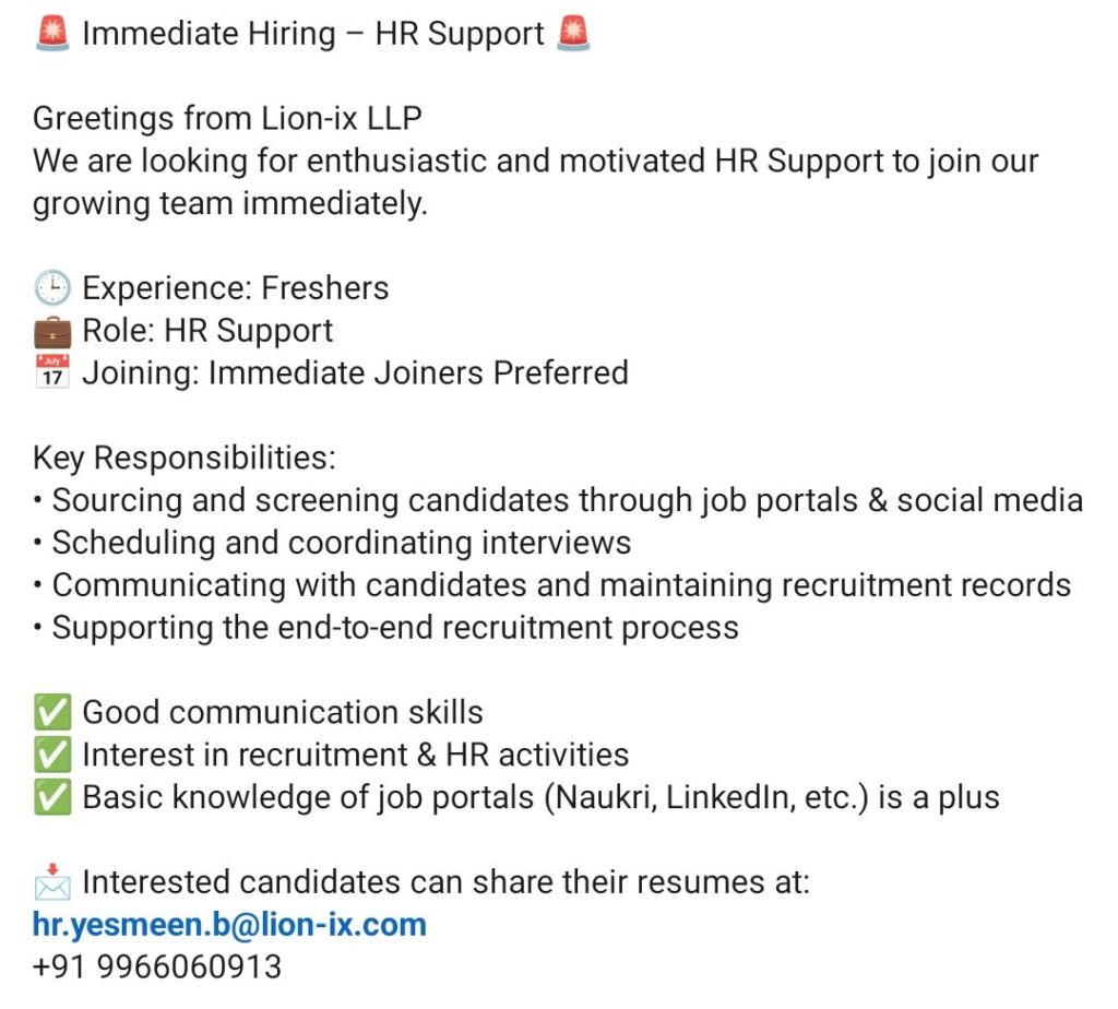 HomeHomeHR Support (Fresher) – Lion-ix LLP – Immediate Joiner – Recruitment Coordination & Sourcing HR Support (Fresher) – Lion-ix LLP – Immediate Joiner – Recruitment Coordination & Sourcing chandrakanth April 20, 2026 Post Views: 2 Related posts: SSterling Hospitals Hiring 2025 | Medical Officer, Staff Nurse & Assistant Manager Jobs AP కాంట్రాక్ట్ / అవుట్సోర్సింగ్ ఉద్యోగాలు 2025 | RMC Jobs Recruitment 2025 | అర్హత & దరఖాస్తు వివరాలు Sai Life Sciences Walk-In Interview 2026 | Analytical R&D (API) Jobs – Hyderabad Fresher Walk-in Interviews in Daman: B.Pharm, M.Sc, ITI, Diploma | USV Pharma Jobs – 18 Jan 2026 Share Pinterest Tweet Email Linkedin Whatsapp Telegram Prev Article Next Article Leave a Reply Cancel Reply Save my name, email, and website in this browser for the next time I comment.