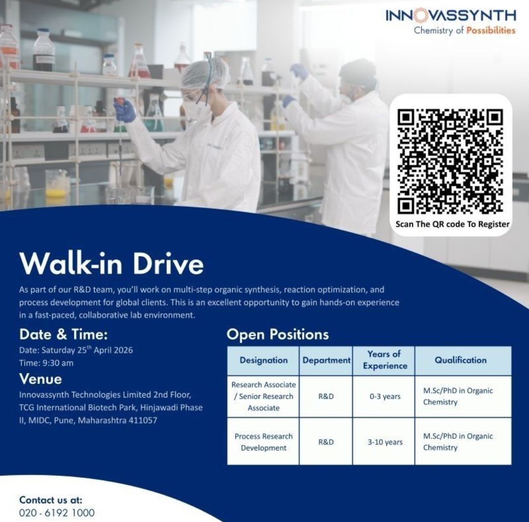 • Innovassynth Walk-In Drive 25 April 2026 | R&D Jobs Pune | Research Associate, Process Development