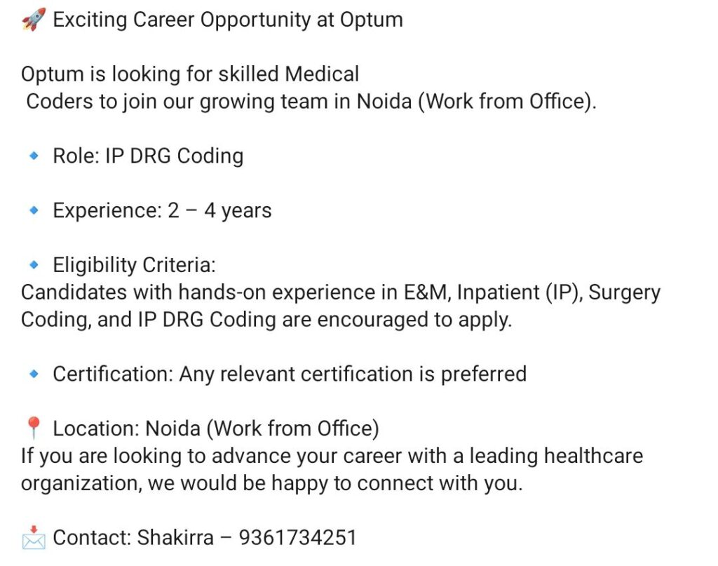 • IP DRG Coder – Optum (Noida, WFO) – 2–4 Years Exp – E&M, Inpatient, Surgery Coding – Certification Preferred