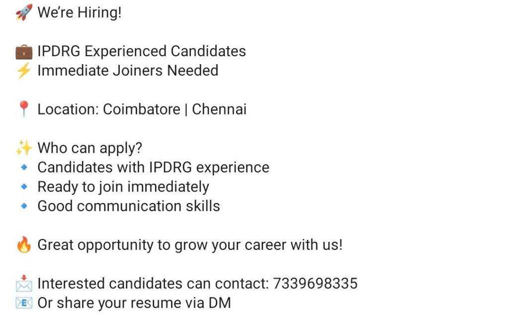 HomeHomeIPDRG Medical Coder – Coimbatore & Chennai – Immediate Joiners – Experienced Only – Contact Now IPDRG Medical Coder – Coimbatore & Chennai – Immediate Joiners – Experienced Only – Contact Now chandrakanth April 12, 2026 Post Views: 5 Related posts: Hiring Home Health Coding Experts: Team Lead, QA & Coder | Mumbai, Hyderabad, Chennai | Up to ₹15 LPA Patient Calling RCM Jobs in Chennai – Night Shift | 1–3 Years Experience | Immediate Joining HR Executive Job in Chennai & Madurai | Zaitoon Restaurants | ₹25k–₹30k | Hiring Now Remote Medical Coder – Freshers & Experienced – Trispect Health Medics (WFH, Night Shift, Training Provided) Share Pinterest Tweet Email Linkedin Whatsapp Telegram Prev Article Next Article Leave a Reply Cancel Reply Save my name, email, and website in this browser for the next time I comment.