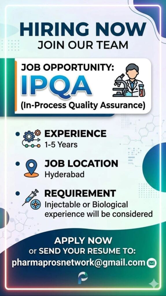 HomeHomeIPQA (In-Process Quality Assurance) – Hyderabad – 1–5 Years Exp – Injectable or Biological Experience Required IPQA (In-Process Quality Assurance) – Hyderabad – 1–5 Years Exp – Injectable or Biological Experience Required chandrakanth April 21, 2026 Post Views: 1 Related posts: SSterling Hospitals Hiring 2025 | Medical Officer, Staff Nurse & Assistant Manager Jobs AP కాంట్రాక్ట్ / అవుట్సోర్సింగ్ ఉద్యోగాలు 2025 | RMC Jobs Recruitment 2025 | అర్హత & దరఖాస్తు వివరాలు Sai Life Sciences Walk-In Interview 2026 | Analytical R&D (API) Jobs – Hyderabad Fresher Walk-in Interviews in Daman: B.Pharm, M.Sc, ITI, Diploma | USV Pharma Jobs – 18 Jan 2026 Share Pinterest Tweet Email Linkedin Whatsapp Telegram Prev Article Next Article Leave a Reply Cancel Reply Save my name, email, and website in this browser for the next time I comment.