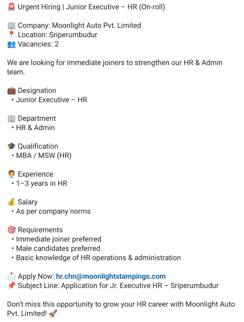 HomeHomeJunior Executive – HR (On-Roll) – Moonlight Auto (Sriperumbudur) – 1–3 Yrs Exp – MBA/MSW (HR) – Immediate Joiner Junior Executive – HR (On-Roll) – Moonlight Auto (Sriperumbudur) – 1–3 Yrs Exp – MBA/MSW (HR) – Immediate Joiner chandrakanth April 12, 2026 Post Views: 5 Related posts: Fresher Walk-in Interviews in Daman: B.Pharm, M.Sc, ITI, Diploma | USV Pharma Jobs – 18 Jan 2026 Virtual Drive: Cadila Pharma Hiring – Production Officer/Executive | Dholka OSD Plant | 19 Jan Interview Radiology Coder & QA Walk-in Interview 2026 – Mumbai, Hyderabad, Noida | Hiring Certified Immediate Joiners Walk-in Interview for Fresher Organic Trainee (M.Sc Organic Chemistry) at Sharmista Research Centre, Ahmedabad – 21st February 2026 Share Pinterest Tweet Email Linkedin Whatsapp Telegram Prev Article Next Article Leave a Reply Cancel Reply Save my name, email, and website in this browser for the next time I comment.