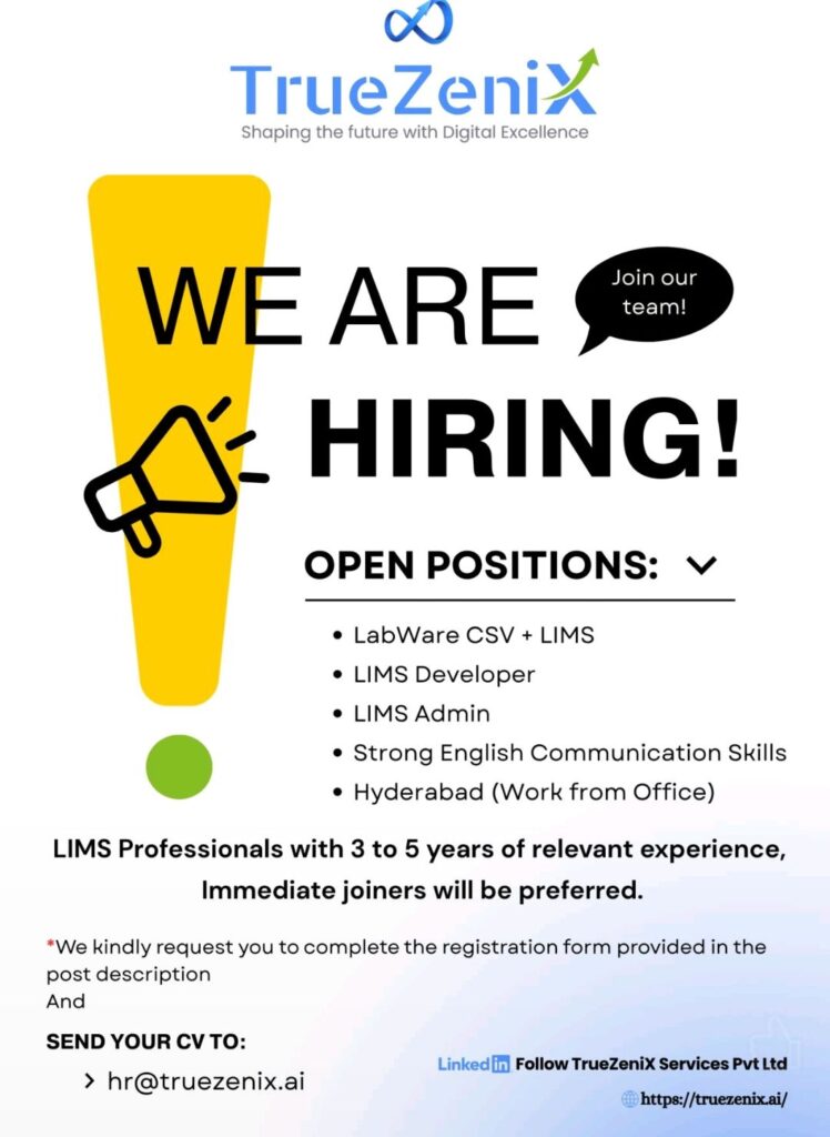 LIMS Developer / Admin / LabWare CSV – TrueZenix (Hyderabad, WFO) – 3–5 Years Exp – Immediate Joiners Preferred