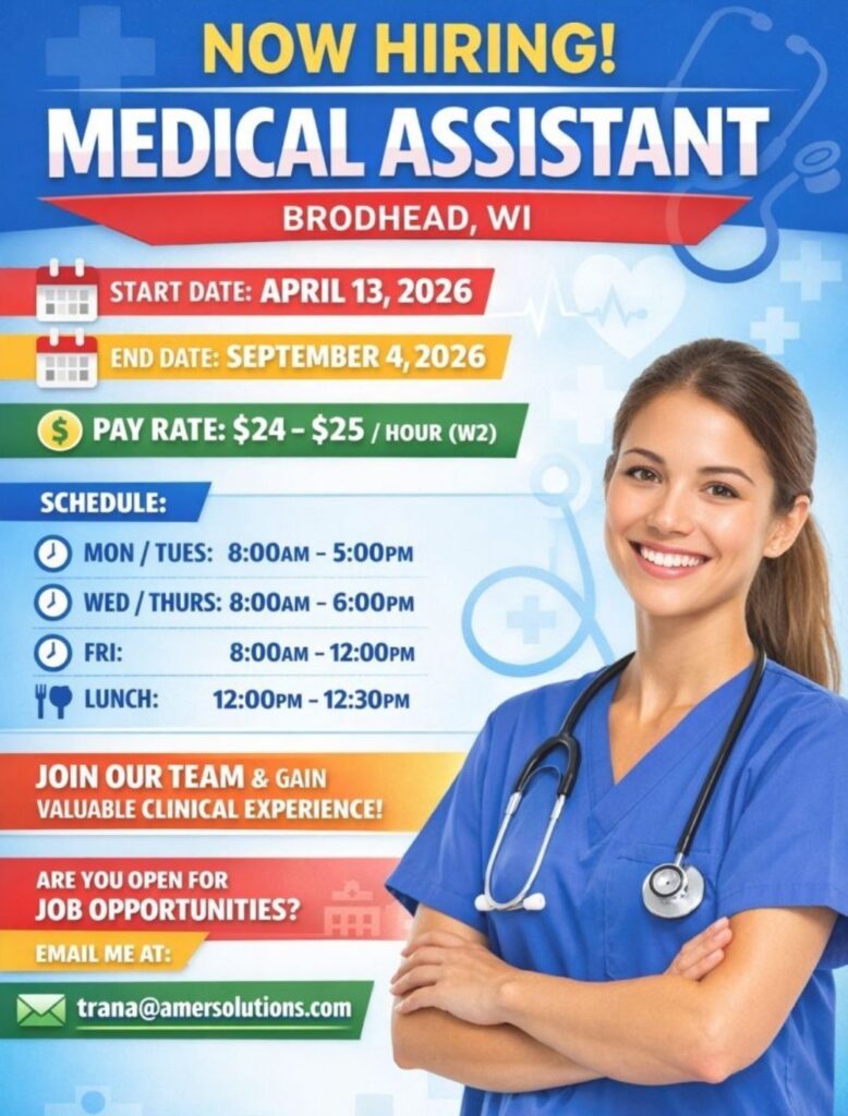 HomeHomeMedical Assistant – Brodhead, WI (Contract) – $24–25/hr – April 13 – Sept 4, 2026 – Clinical Experience Medical Assistant – Brodhead, WI (Contract) – $24–25/hr – April 13 – Sept 4, 2026 – Clinical Experience chandrakanth April 11, 2026 Post Views: 1 Related posts: Hiring Home Health Coding Experts: Team Lead, QA & Coder | Mumbai, Hyderabad, Chennai | Up to ₹15 LPA Patient Calling RCM Jobs in Chennai – Night Shift | 1–3 Years Experience | Immediate Joining HR Executive Job in Chennai & Madurai | Zaitoon Restaurants | ₹25k–₹30k | Hiring Now Remote Medical Coder – Freshers & Experienced – Trispect Health Medics (WFH, Night Shift, Training Provided) Share Pinterest Tweet Email Linkedin Whatsapp Telegram Prev Article Next Article Leave a Reply Cancel Reply Save my name, email, and website in this browser for the next time I comment.