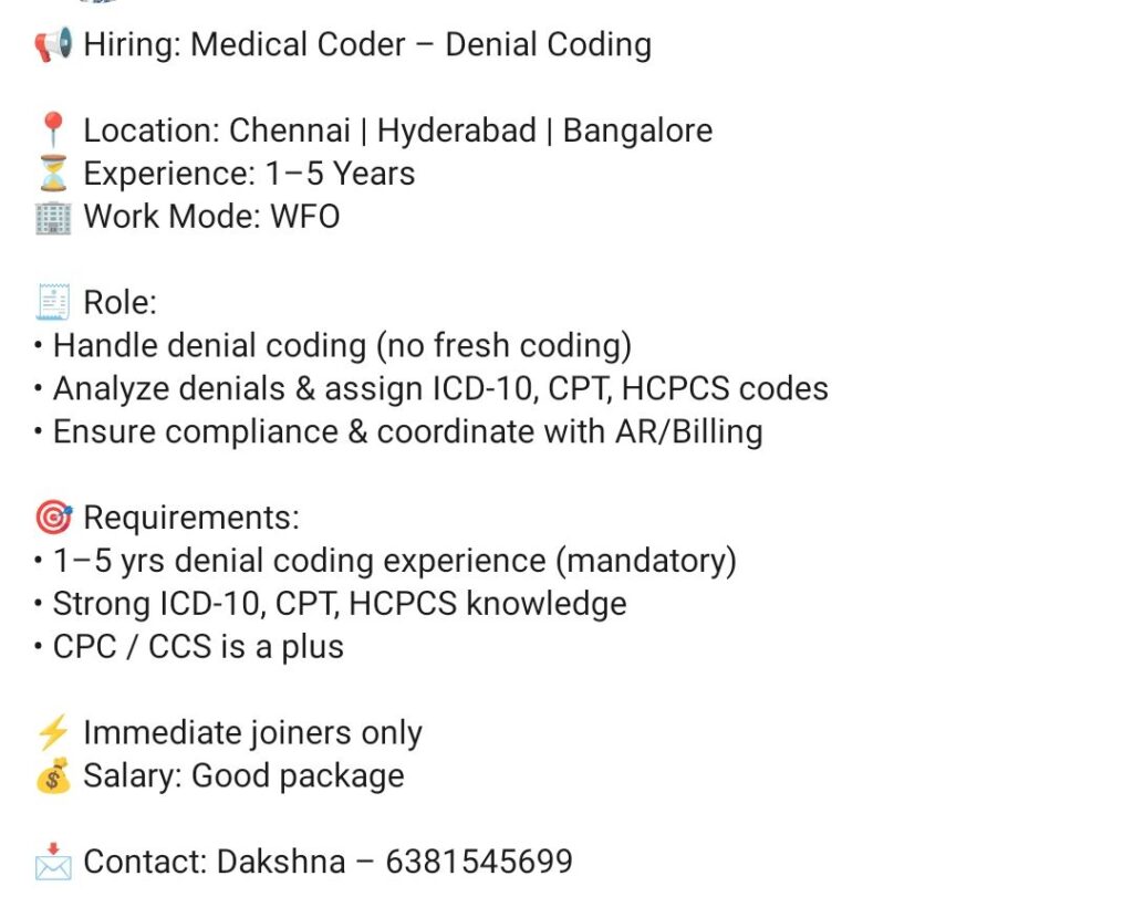 HomeHomeMedical Coder – Denial Coding (1–5 Yrs Exp) – Chennai, Hyderabad, Bangalore – WFO – Immediate Joiners Medical Coder – Denial Coding (1–5 Yrs Exp) – Chennai, Hyderabad, Bangalore – WFO – Immediate Joiners chandrakanth April 10, 2026 Post Views: 1 Related posts: Hiring Home Health Coding Experts: Team Lead, QA & Coder | Mumbai, Hyderabad, Chennai | Up to ₹15 LPA Patient Calling RCM Jobs in Chennai – Night Shift | 1–3 Years Experience | Immediate Joining HR Executive Job in Chennai & Madurai | Zaitoon Restaurants | ₹25k–₹30k | Hiring Now Remote Medical Coder – Freshers & Experienced – Trispect Health Medics (WFH, Night Shift, Training Provided) Share Pinterest Tweet Email Linkedin Whatsapp Telegram Prev Article Next Article Leave a Reply Cancel Reply Save my name, email, and website in this browser for the next time I comment.