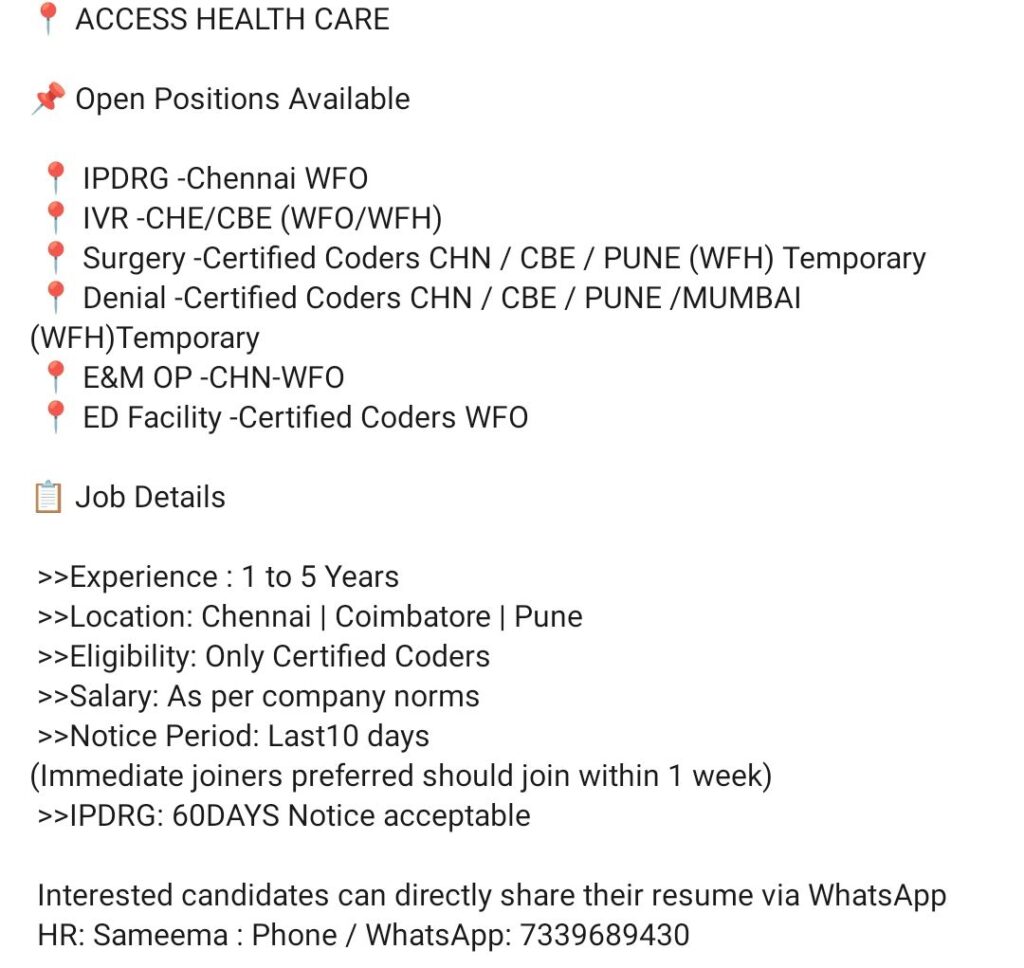HomeHomeMedical Coding Jobs 2026 – IPDRG, IVR, Surgery, Denial, E&M OP, ED Facility – Certified Coders (Chennai, Coimbatore, Pune, Mumbai) – WFO & WFH – Immediate Joiners Medical Coding Jobs 2026 – IPDRG, IVR, Surgery, Denial, E&M OP, ED Facility – Certified Coders (Chennai, Coimbatore, Pune, Mumbai) – WFO & WFH – Immediate Joiners chandrakanth April 5, 2026 Post Views: 8 Related posts: SSterling Hospitals Hiring 2025 | Medical Officer, Staff Nurse & Assistant Manager Jobs AP కాంట్రాక్ట్ / అవుట్సోర్సింగ్ ఉద్యోగాలు 2025 | RMC Jobs Recruitment 2025 | అర్హత & దరఖాస్తు వివరాలు Sai Life Sciences Walk-In Interview 2026 | Analytical R&D (API) Jobs – Hyderabad Fresher Walk-in Interviews in Daman: B.Pharm, M.Sc, ITI, Diploma | USV Pharma Jobs – 18 Jan 2026 Share Pinterest Tweet Email Linkedin Whatsapp Telegram Prev Article Next Article Leave a Reply Cancel Reply Save my name, email, and website in this browser for the next time I comment.