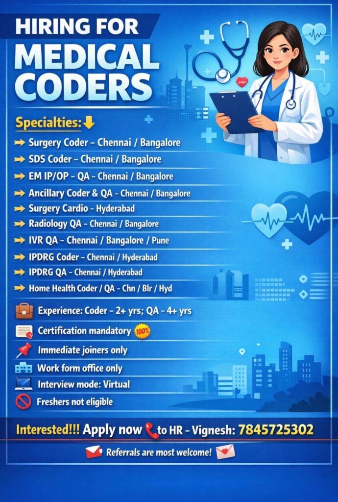 Medical Coding Jobs 2026 – Surgery, SDS, EM IP/OP, Radiology, IVR, IPDRG, Home Health – Chennai, Bangalore, Hyderabad, Pune – Certified Coders & QA (2–4+ Years Exp) – WFO – Immediate Joiners