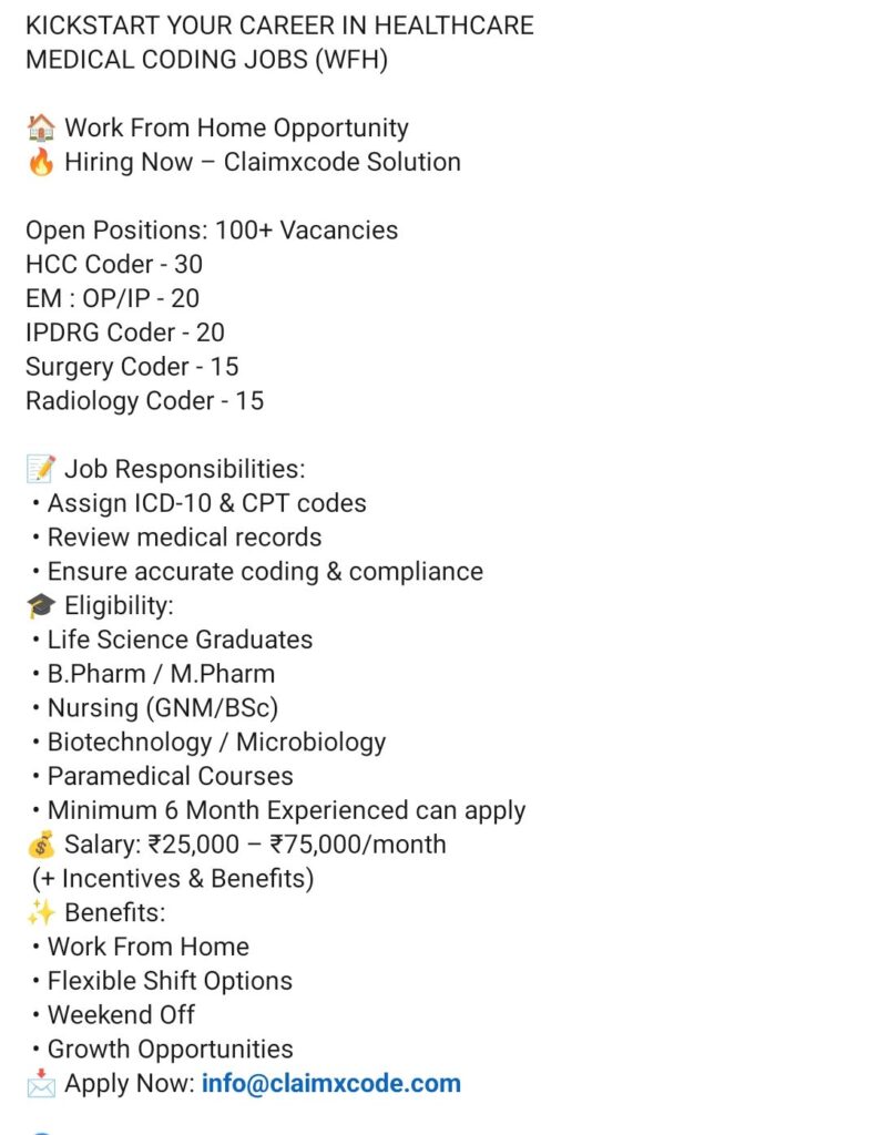 HomeHomeMedical Coding Jobs WFH 2026 – 100+ Vacancies at Claimxcode Solution | ₹25K–75K Salary Medical Coding Jobs WFH 2026 – 100+ Vacancies at Claimxcode Solution | ₹25K–75K Salary chandrakanth April 7, 2026 Post Views: 5 Related posts: SSterling Hospitals Hiring 2025 | Medical Officer, Staff Nurse & Assistant Manager Jobs AP కాంట్రాక్ట్ / అవుట్సోర్సింగ్ ఉద్యోగాలు 2025 | RMC Jobs Recruitment 2025 | అర్హత & దరఖాస్తు వివరాలు Sai Life Sciences Walk-In Interview 2026 | Analytical R&D (API) Jobs – Hyderabad Fresher Walk-in Interviews in Daman: B.Pharm, M.Sc, ITI, Diploma | USV Pharma Jobs – 18 Jan 2026 Share Pinterest Tweet Email Linkedin Whatsapp Telegram Prev Article Next Article Leave a Reply Cancel Reply Save my name, email, and website in this browser for the next time I comment.