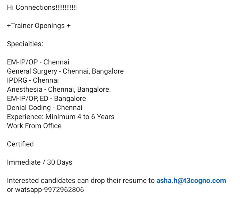HomeHomeMedical Coding Trainer (EM-IP/OP, Surgery, IPDRG, Anesthesia, ED, Denial) – Chennai & Bangalore – 4–6 Yrs Exp – Certified – WFO Medical Coding Trainer (EM-IP/OP, Surgery, IPDRG, Anesthesia, ED, Denial) – Chennai & Bangalore – 4–6 Yrs Exp – Certified – WFO chandrakanth April 12, 2026 Post Views: 1 Related posts: SSterling Hospitals Hiring 2025 | Medical Officer, Staff Nurse & Assistant Manager Jobs Trainee HCC Coder – Bangalore (Virtual Interview) – 3–11 Months Exp – CRC/CPC/CCS Mandatory – Immediate Joiner R&D Scientist, QA Officer, Analyst, Lift Operator – Multani Pharmaceuticals (Haridwar) – 3–7 Yrs Exp – B.Pharm / M.Sc / Diploma Trainee Medical Coder (CPC Certified Fresher) – Omega Healthcare (Chennai) – ₹24K CTC / ₹19K In-Hand – Virtual Interview Share Pinterest Tweet Email Linkedin Whatsapp Telegram Prev Article Next Article Leave a Reply Cancel Reply Save my name, email, and website in this browser for the next time I comment.