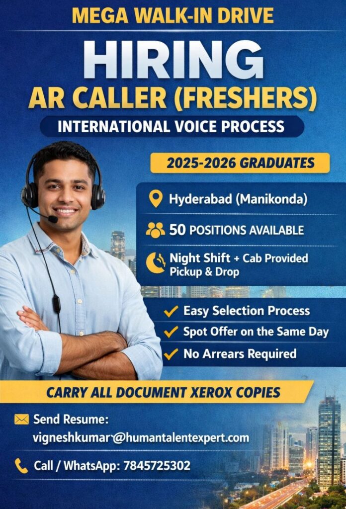 HomeHomeMega Walk-In – AR Caller (Freshers, International Voice Process) – Hyderabad (Manikonda) – Night Shift + Cab – 50 Openings Mega Walk-In – AR Caller (Freshers, International Voice Process) – Hyderabad (Manikonda) – Night Shift + Cab – 50 Openings chandrakanth April 12, 2026 Post Views: 4 Related posts: Hiring Home Health Coding Experts: Team Lead, QA & Coder | Mumbai, Hyderabad, Chennai | Up to ₹15 LPA Patient Calling RCM Jobs in Chennai – Night Shift | 1–3 Years Experience | Immediate Joining HR Executive Job in Chennai & Madurai | Zaitoon Restaurants | ₹25k–₹30k | Hiring Now Remote Medical Coder – Freshers & Experienced – Trispect Health Medics (WFH, Night Shift, Training Provided) Share Pinterest Tweet Email Linkedin Whatsapp Telegram Prev Article Next Article Leave a Reply Cancel Reply Save my name, email, and website in this browser for the next time I comment.
