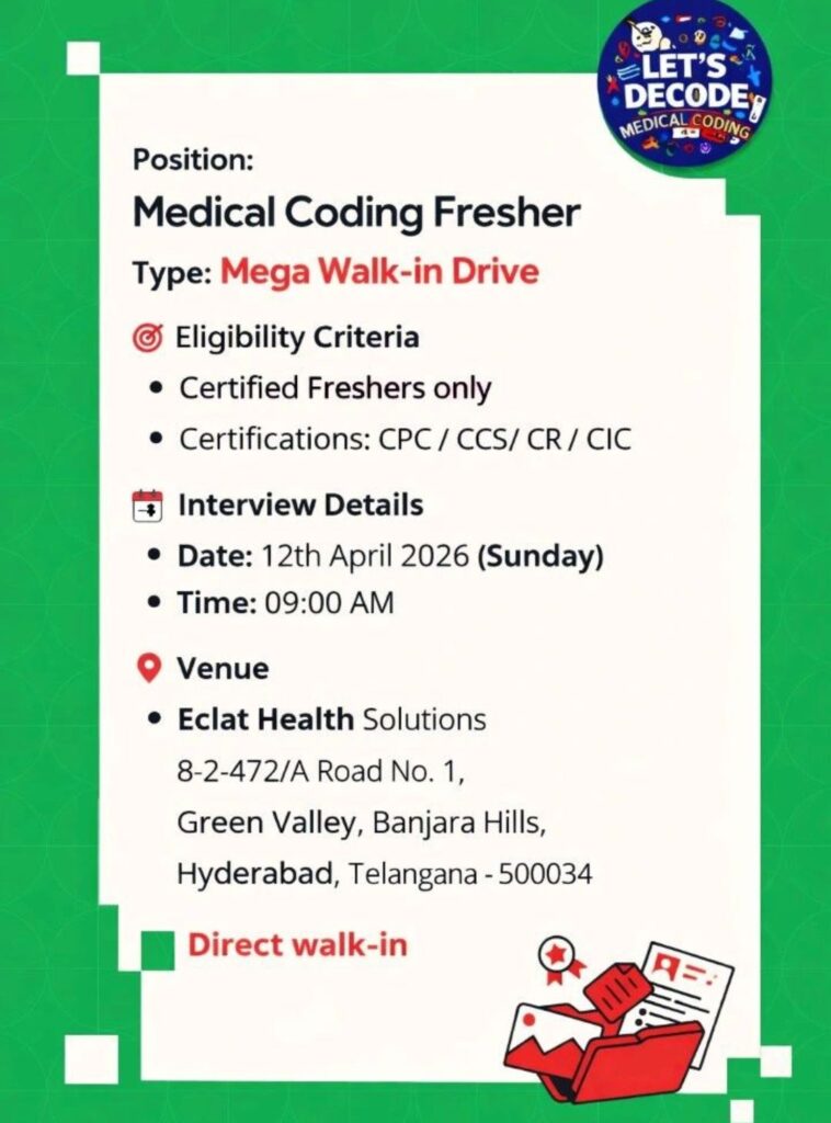 Mega Walk-In Drive – Medical Coding Fresher (CPC/CCS/CRC/CIC) – Eclat Health Solutions Hyderabad – April 12, 2026