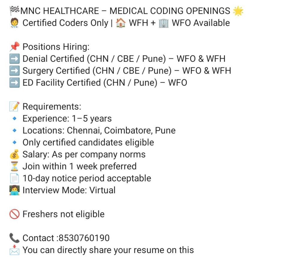 HomeHomeMNC Healthcare Medical Coding Jobs 2026 | Certified Coders (1–5 Years) – WFH/WFO in Chennai, Coimbatore, Pune MNC Healthcare Medical Coding Jobs 2026 | Certified Coders (1–5 Years) – WFH/WFO in Chennai, Coimbatore, Pune chandrakanth April 4, 2026 Post Views: 2 Related posts: SSterling Hospitals Hiring 2025 | Medical Officer, Staff Nurse & Assistant Manager Jobs AP కాంట్రాక్ట్ / అవుట్సోర్సింగ్ ఉద్యోగాలు 2025 | RMC Jobs Recruitment 2025 | అర్హత & దరఖాస్తు వివరాలు Sai Life Sciences Walk-In Interview 2026 | Analytical R&D (API) Jobs – Hyderabad Fresher Walk-in Interviews in Daman: B.Pharm, M.Sc, ITI, Diploma | USV Pharma Jobs – 18 Jan 2026 Share Pinterest Tweet Email Linkedin Whatsapp Telegram Prev Article Next Article Leave a Reply Cancel Reply Save my name, email, and website in this browser for the next time I comment.