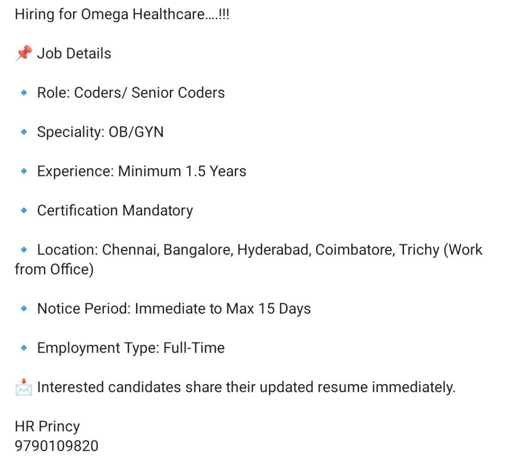 HomeHomeOB/GYN Medical Coder – Omega Healthcare – Chennai, Bangalore, Hyderabad, Coimbatore, Trichy (On-Site) – 1.5+ Yrs Exp – Certification Mandatory OB/GYN Medical Coder – Omega Healthcare – Chennai, Bangalore, Hyderabad, Coimbatore, Trichy (On-Site) – 1.5+ Yrs Exp – Certification Mandatory chandrakanth April 8, 2026 Post Views: 3 Related posts: SSterling Hospitals Hiring 2025 | Medical Officer, Staff Nurse & Assistant Manager Jobs AP కాంట్రాక్ట్ / అవుట్సోర్సింగ్ ఉద్యోగాలు 2025 | RMC Jobs Recruitment 2025 | అర్హత & దరఖాస్తు వివరాలు Sai Life Sciences Walk-In Interview 2026 | Analytical R&D (API) Jobs – Hyderabad Fresher Walk-in Interviews in Daman: B.Pharm, M.Sc, ITI, Diploma | USV Pharma Jobs – 18 Jan 2026 Share Pinterest Tweet Email Linkedin Whatsapp Telegram Prev Article Next Article Leave a Reply Cancel Reply Save my name, email, and website in this browser for the next time I comment.