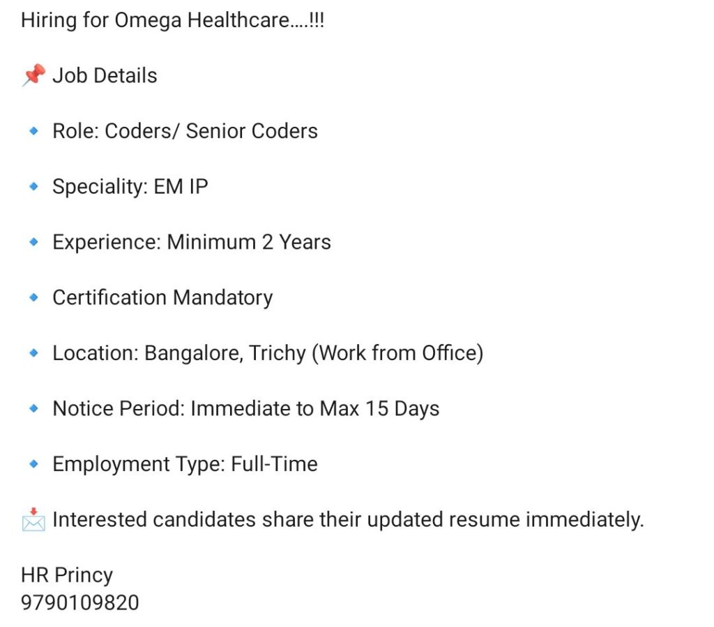 HomeHomeOmega Healthcare Coder Jobs 2026 – EM IP, Certification Mandatory Omega Healthcare Coder Jobs 2026 – EM IP, Certification Mandatory chandrakanth April 8, 2026 Post Views: 2 Related posts: Hiring Home Health Coding Experts: Team Lead, QA & Coder | Mumbai, Hyderabad, Chennai | Up to ₹15 LPA Patient Calling RCM Jobs in Chennai – Night Shift | 1–3 Years Experience | Immediate Joining HCC Medical Coder Walk-In Drive 2026 – Cotiviti Coimbatore (Apr 6–10) Assistant Manager – Regulatory Affairs (ROW Market, OSD) Share Pinterest Tweet Email Linkedin Whatsapp Telegram Prev Article Next Article Leave a Reply Cancel Reply Save my name, email, and website in this browser for the next time I comment.