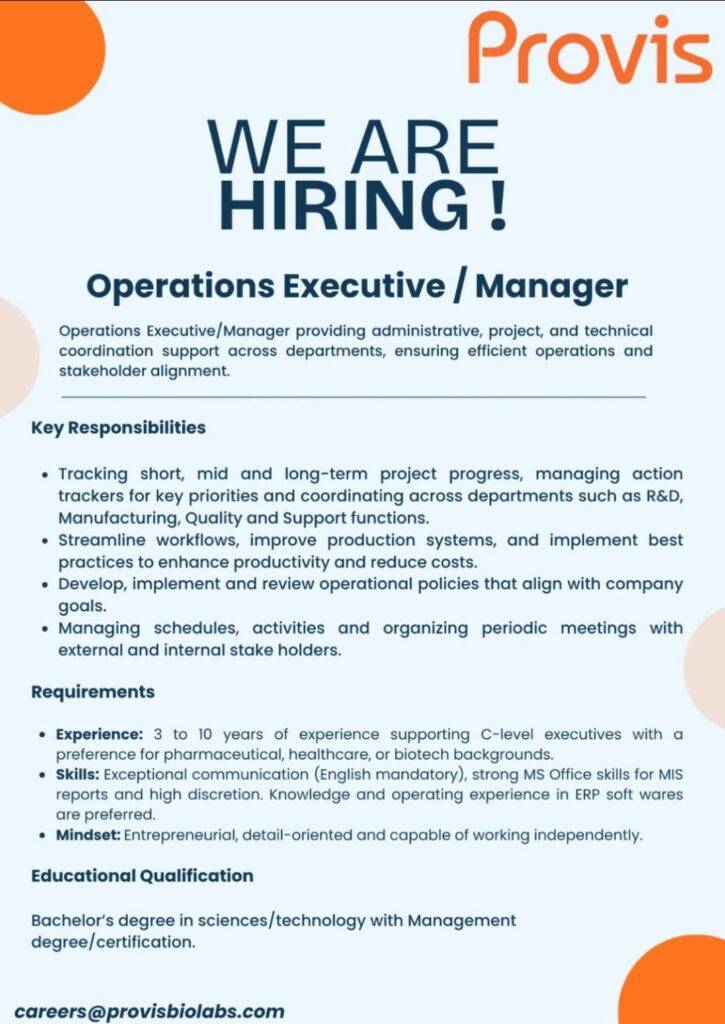 Operations Executive / Manager – Provis Biolabs – 3–10 Yrs Exp – Pharma/Biotech Background – ERP & MS Office