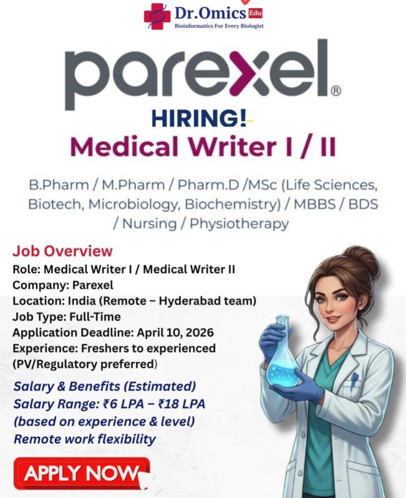 HomeHomeParexel Hiring Medical Writer I/II (Remote, India) – B.Pharm, M.Pharm, Life Sciences, Freshers Apply Parexel Hiring Medical Writer I/II (Remote, India) – B.Pharm, M.Pharm, Life Sciences, Freshers Apply chandrakanth April 2, 2026 Post Views: 7 Related posts: Walk-in Interview for Fresher Organic Trainee (M.Sc Organic Chemistry) at Sharmista Research Centre, Ahmedabad – 21st February 2026 Neuland Labs Walk-in Interview 2026: Production & QC Chemist/Officer | Daund (Maharashtra) | March 6-7 Medical Coder (HCC) Jobs – Work From Home – CRC/CPC Certified | Omega Healthcare Medical Coding Team Lead Job in Chennai | E&M / IP / OP | CPC Certified | Work from Office Share Pinterest Tweet Email Linkedin Whatsapp Telegram Prev Article Next Article Leave a Reply Cancel Reply Save my name, email, and website in this browser for the next time I comment.