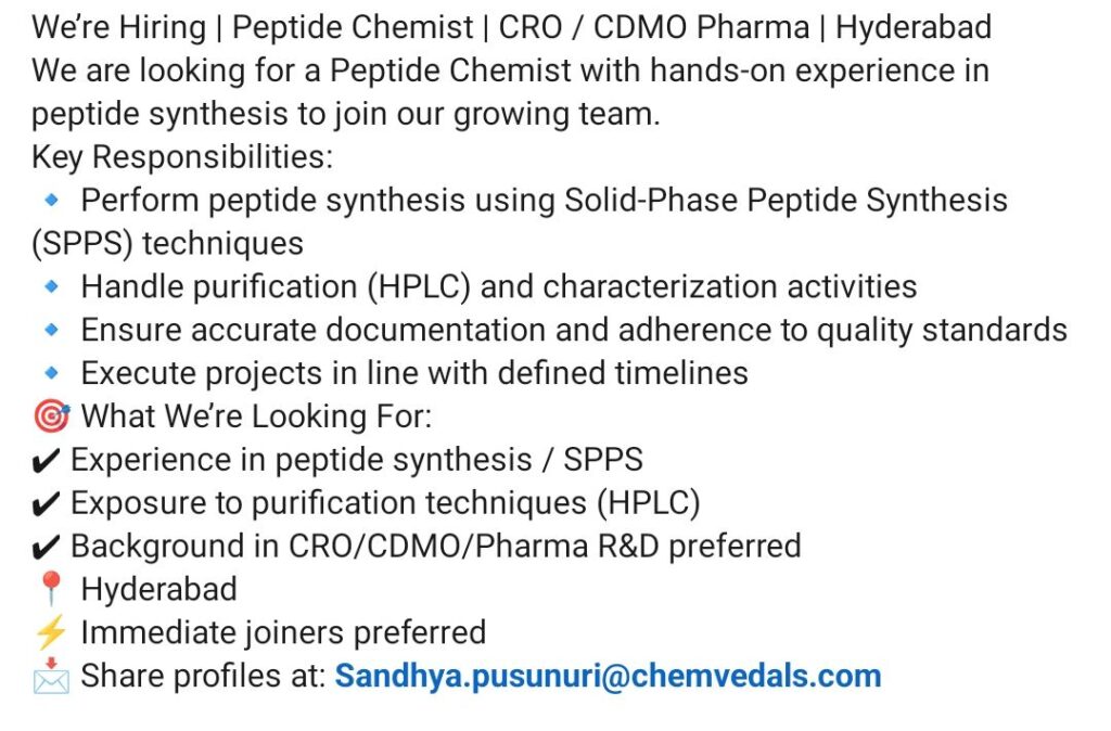 HomeHomePeptide Chemist Job in Hyderabad | SPPS & HPLC Role at CRO/CDMO Pharma Peptide Chemist Job in Hyderabad | SPPS & HPLC Role at CRO/CDMO Pharma chandrakanth April 4, 2026 Post Views: 1 Related posts: SSterling Hospitals Hiring 2025 | Medical Officer, Staff Nurse & Assistant Manager Jobs AP కాంట్రాక్ట్ / అవుట్సోర్సింగ్ ఉద్యోగాలు 2025 | RMC Jobs Recruitment 2025 | అర్హత & దరఖాస్తు వివరాలు Sai Life Sciences Walk-In Interview 2026 | Analytical R&D (API) Jobs – Hyderabad Fresher Walk-in Interviews in Daman: B.Pharm, M.Sc, ITI, Diploma | USV Pharma Jobs – 18 Jan 2026 Share Pinterest Tweet Email Linkedin Whatsapp Telegram Prev Article Leave a Reply Cancel Reply Save my name, email, and website in this browser for the next time I comment.