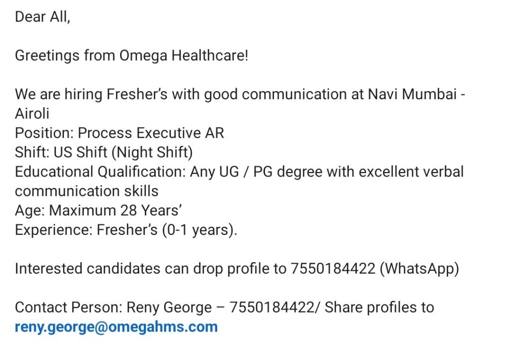 • Process Executive AR (Fresher) – Omega Healthcare (Navi Mumbai – Airoli) – US Night Shift – Any Graduate – Excellent Communication