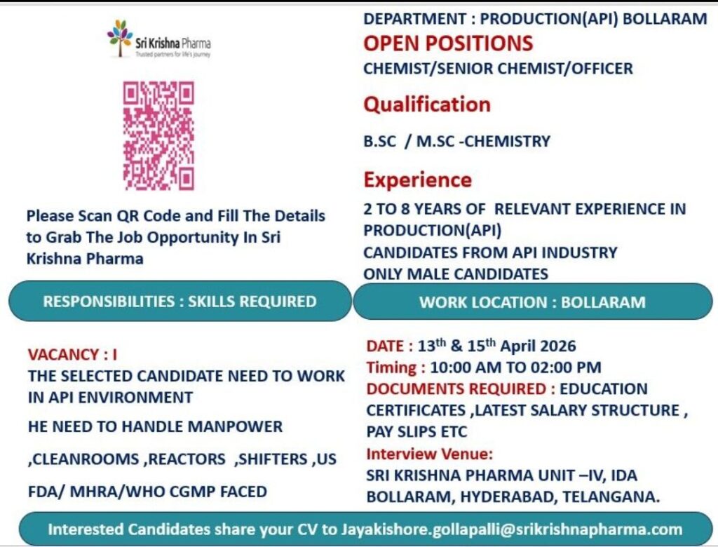 HomeHomeProduction Chemist (API) – Sri Krishna Pharma (Bollaram, Hyderabad) – 2–8 Yrs Exp – B.Sc/M.Sc Chemistry – Walk-In April 13-15, 2026 Production Chemist (API) – Sri Krishna Pharma (Bollaram, Hyderabad) – 2–8 Yrs Exp – B.Sc/M.Sc Chemistry – Walk-In April 13-15, 2026 chandrakanth April 12, 2026 Post Views: 4 Related posts: Hiring Home Health Coding Experts: Team Lead, QA & Coder | Mumbai, Hyderabad, Chennai | Up to ₹15 LPA Patient Calling RCM Jobs in Chennai – Night Shift | 1–3 Years Experience | Immediate Joining HR Executive Job in Chennai & Madurai | Zaitoon Restaurants | ₹25k–₹30k | Hiring Now Remote Medical Coder – Freshers & Experienced – Trispect Health Medics (WFH, Night Shift, Training Provided) Share Pinterest Tweet Email Linkedin Whatsapp Telegram Prev Article Next Article Leave a Reply Cancel Reply Save my name, email, and website in this browser for the next time I comment.