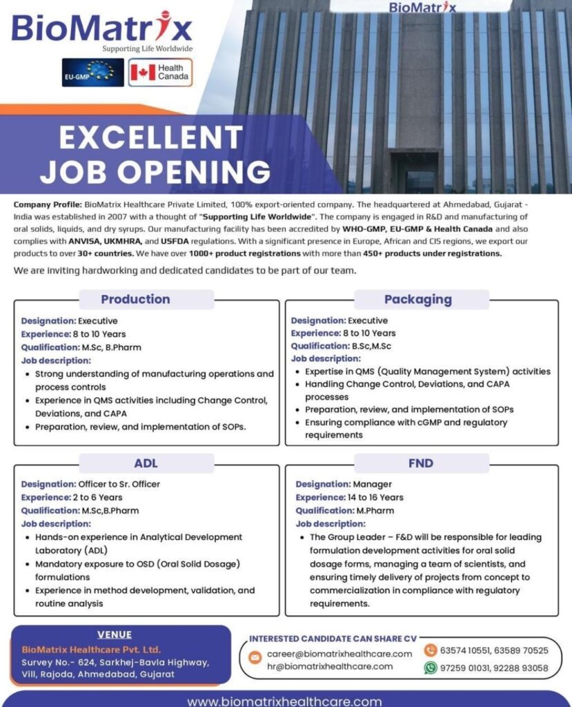 HomeHomeProduction, Packaging, ADL, FND – Biomatrix Healthcare (Ahmedabad) – 2–16 Years Exp – M.Sc / B.Pharm / M.Pharm – OSD Formulations Production, Packaging, ADL, FND – Biomatrix Healthcare (Ahmedabad) – 2–16 Years Exp – M.Sc / B.Pharm / M.Pharm – OSD Formulations chandrakanth April 24, 2026 Post Views: 6 Related posts: Urgent Hiring Process R&D Chemists at Nasense Labs | Walk-in Interview Hyderabad 2026 | B.Sc M.Sc Chemistry Jobs in API Pharma Hiring Medical Coder / QA Denials | Work From Home WFO | Chennai Pune Coimbatore Mumbai Walk-In Interview for Medical Coding Freshers (Non-Certified) | LOGIXHealth | Coimbatore | 2nd March 2026 | CTC 3.11 LPA + Cab Axis Clinicals Walk-in Drive Hyderabad 2026 | Trainee Research Associate for 2023-2025 Batch (Bioanalytical/Medical Writing) Share Pinterest Tweet Email Linkedin Whatsapp Telegram Prev Article Next Article Leave a Reply Cancel Reply Save my name, email, and website in this browser for the next time I comment.