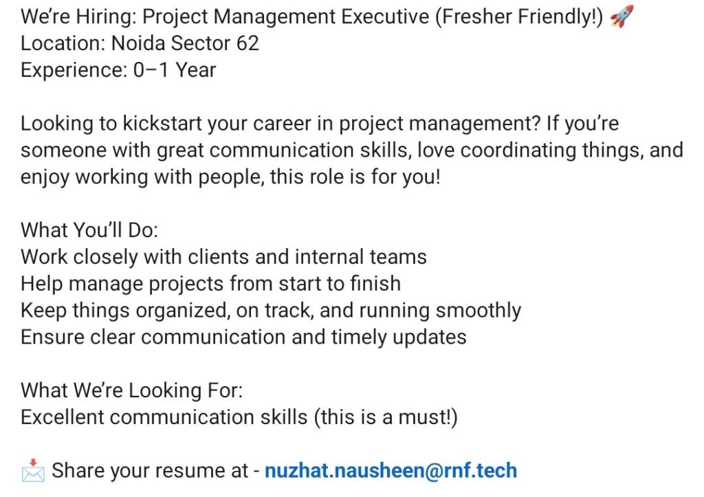 HomeHomeProject Management Executive (Fresher) – Noida Sector 62 – 0–1 Year Exp – Strong Communication Skills Required Project Management Executive (Fresher) – Noida Sector 62 – 0–1 Year Exp – Strong Communication Skills Required chandrakanth April 21, 2026 Post Views: 1 Related posts: SSterling Hospitals Hiring 2025 | Medical Officer, Staff Nurse & Assistant Manager Jobs AP కాంట్రాక్ట్ / అవుట్సోర్సింగ్ ఉద్యోగాలు 2025 | RMC Jobs Recruitment 2025 | అర్హత & దరఖాస్తు వివరాలు Sai Life Sciences Walk-In Interview 2026 | Analytical R&D (API) Jobs – Hyderabad Fresher Walk-in Interviews in Daman: B.Pharm, M.Sc, ITI, Diploma | USV Pharma Jobs – 18 Jan 2026 Share Pinterest Tweet Email Linkedin Whatsapp Telegram Prev Article Leave a Reply Cancel Reply Save my name, email, and website in this browser for the next time I comment.