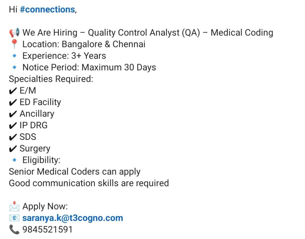 HomeHomeQuality Control Analyst (QA) – Medical Coding (E/M, ED, Ancillary, IPDRG, SDS, Surgery) – Bangalore & Chennai – 3+ Years Exp Quality Control Analyst (QA) – Medical Coding (E/M, ED, Ancillary, IPDRG, SDS, Surgery) – Bangalore & Chennai – 3+ Years Exp chandrakanth April 12, 2026 Post Views: 1 Related posts: Hiring Home Health Coding Experts: Team Lead, QA & Coder | Mumbai, Hyderabad, Chennai | Up to ₹15 LPA Patient Calling RCM Jobs in Chennai – Night Shift | 1–3 Years Experience | Immediate Joining HR Executive Job in Chennai & Madurai | Zaitoon Restaurants | ₹25k–₹30k | Hiring Now Remote Medical Coder – Freshers & Experienced – Trispect Health Medics (WFH, Night Shift, Training Provided) Share Pinterest Tweet Email Linkedin Whatsapp Telegram Prev Article Next Article Leave a Reply Cancel Reply Save my name, email, and website in this browser for the next time I comment.