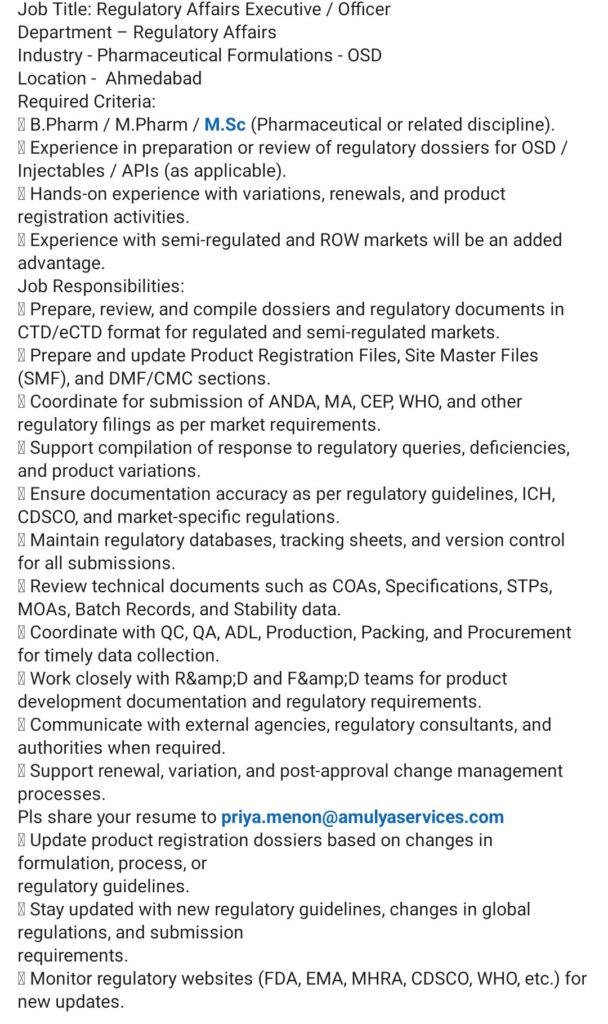 HomeHomeRegulatory Affairs Executive / Officer – Ahmedabad (OSD Formulations) – CTD/eCTD, Variations, Registrations – B.Pharm / M.Pharm / M.Sc Regulatory Affairs Executive / Officer – Ahmedabad (OSD Formulations) – CTD/eCTD, Variations, Registrations – B.Pharm / M.Pharm / M.Sc chandrakanth April 11, 2026 Post Views: 1 Related posts: Hiring Home Health Coding Experts: Team Lead, QA & Coder | Mumbai, Hyderabad, Chennai | Up to ₹15 LPA Patient Calling RCM Jobs in Chennai – Night Shift | 1–3 Years Experience | Immediate Joining HR Executive Job in Chennai & Madurai | Zaitoon Restaurants | ₹25k–₹30k | Hiring Now Remote Medical Coder – Freshers & Experienced – Trispect Health Medics (WFH, Night Shift, Training Provided) Share Pinterest Tweet Email Linkedin Whatsapp Telegram Prev Article Next Article Leave a Reply Cancel Reply Save my name, email, and website in this browser for the next time I comment.