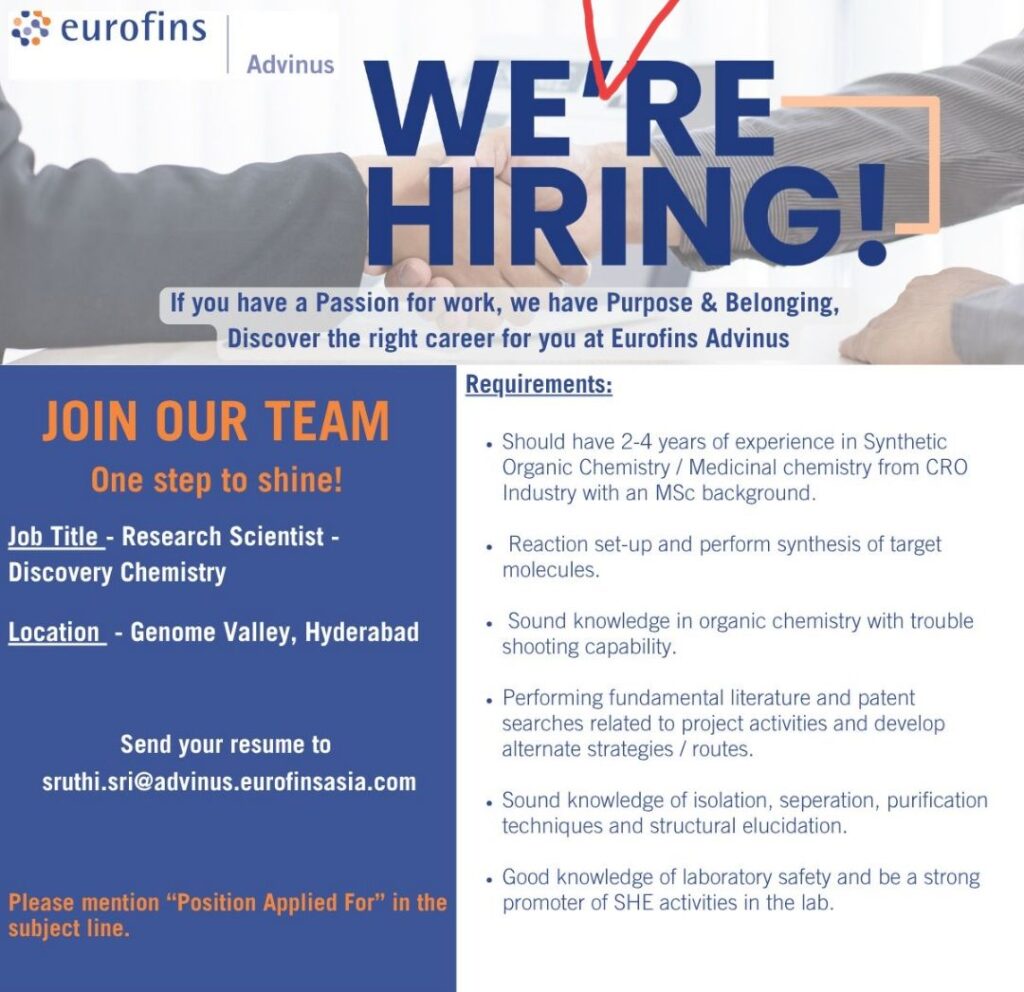 Research Scientist – Discovery Chemistry Job | Eurofins Advinus Hyderabad | MSc Organic Chemistry