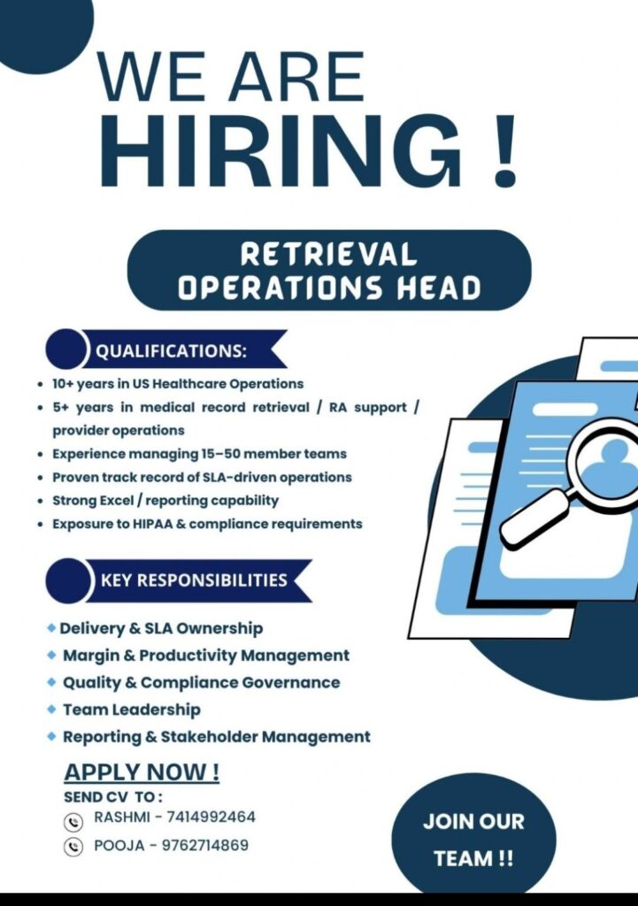 Tags: Operations Head Jobs, US Healthcare, Medical Records Retrieval, HIPAA, Team Leadership, SLA Management, Healthcare BPO