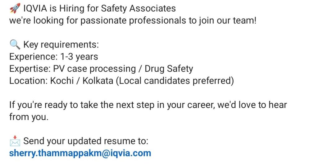 HomeHomeSafety Associate (PV Case Processing / Drug Safety) – IQVIA (Kochi / Kolkata) – 1–3 Years Exp – Local Candidates Preferred Safety Associate (PV Case Processing / Drug Safety) – IQVIA (Kochi / Kolkata) – 1–3 Years Exp – Local Candidates Preferred chandrakanth April 21, 2026 Post Views: 2 Related posts: SSterling Hospitals Hiring 2025 | Medical Officer, Staff Nurse & Assistant Manager Jobs AP కాంట్రాక్ట్ / అవుట్సోర్సింగ్ ఉద్యోగాలు 2025 | RMC Jobs Recruitment 2025 | అర్హత & దరఖాస్తు వివరాలు Sai Life Sciences Walk-In Interview 2026 | Analytical R&D (API) Jobs – Hyderabad Fresher Walk-in Interviews in Daman: B.Pharm, M.Sc, ITI, Diploma | USV Pharma Jobs – 18 Jan 2026 Share Pinterest Tweet Email Linkedin Whatsapp Telegram Prev Article Next Article Leave a Reply Cancel Reply Save my name, email, and website in this browser for the next time I comment.