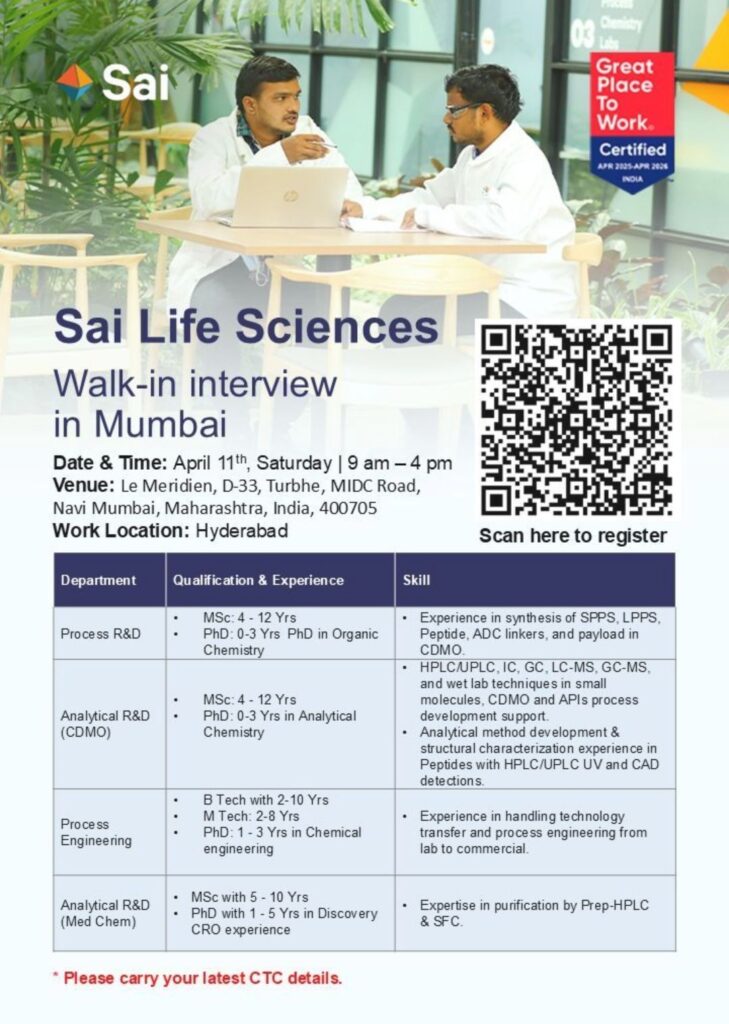 Sai Life Sciences Walk-in Interview Mumbai – April 11 | Process R&D, Analytical R&D, Process Engineering Roles