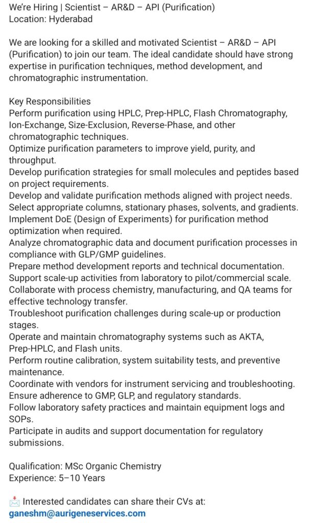 HomeHomeScientist – AR&D (API Purification) – Hyderabad – 5–10 Yrs Exp – HPLC, Prep-HPLC, Flash Chromatography – M.Sc Organic Chemistry Scientist – AR&D (API Purification) – Hyderabad – 5–10 Yrs Exp – HPLC, Prep-HPLC, Flash Chromatography – M.Sc Organic Chemistry chandrakanth April 10, 2026 Post Views: 1 Related posts: Hiring Home Health Coding Experts: Team Lead, QA & Coder | Mumbai, Hyderabad, Chennai | Up to ₹15 LPA Patient Calling RCM Jobs in Chennai – Night Shift | 1–3 Years Experience | Immediate Joining HR Executive Job in Chennai & Madurai | Zaitoon Restaurants | ₹25k–₹30k | Hiring Now Remote Medical Coder – Freshers & Experienced – Trispect Health Medics (WFH, Night Shift, Training Provided) Share Pinterest Tweet Email Linkedin Whatsapp Telegram Prev Article Next Article Leave a Reply Cancel Reply Save my name, email, and website in this browser for the next time I comment.