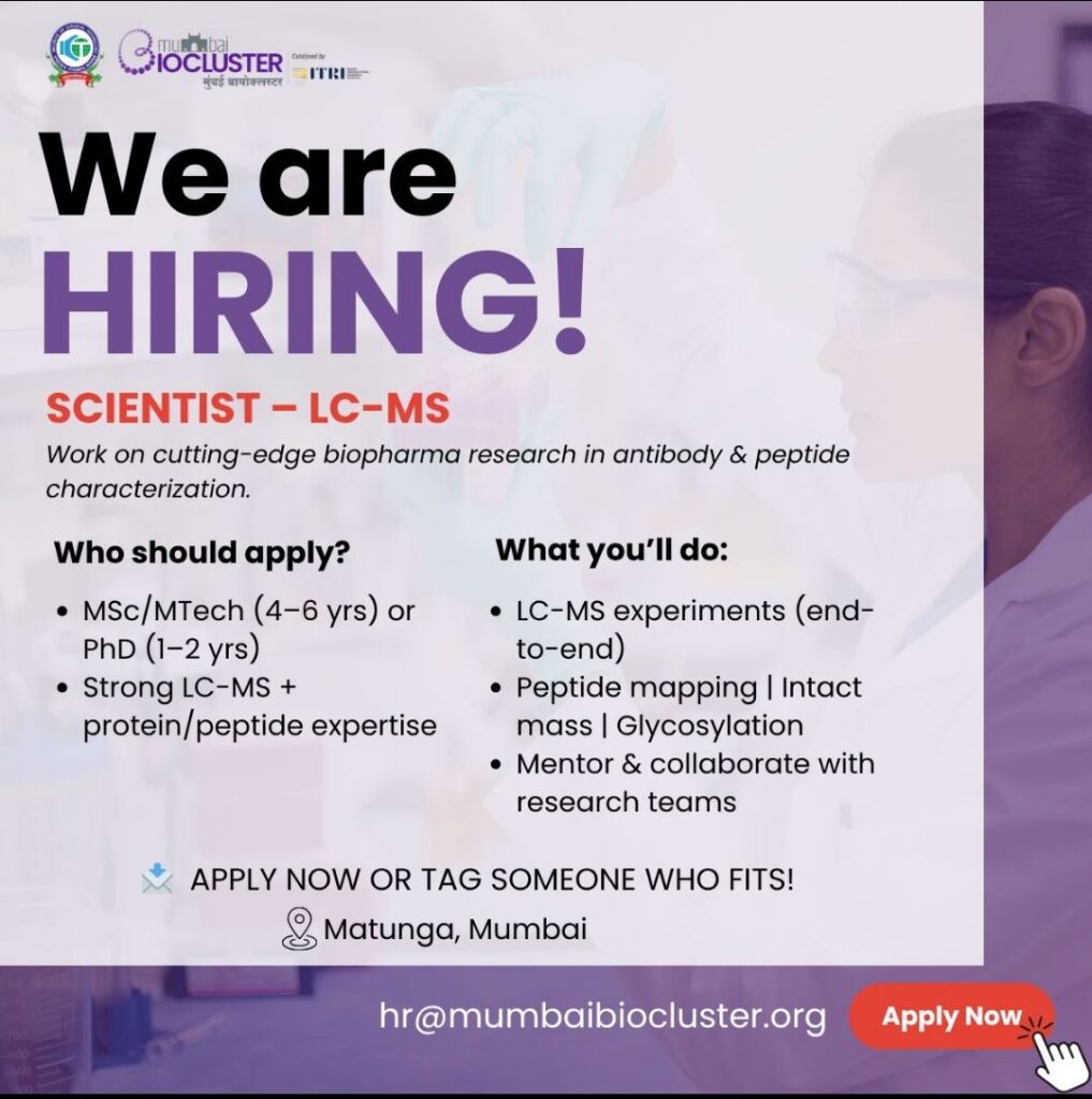 Tags: Scientist Jobs, LC-MS Jobs, Mumbai Jobs, Biopharma, Peptide Mapping, Glycosylation, MSc Jobs, PhD Jobs, Mumbai BioCluster