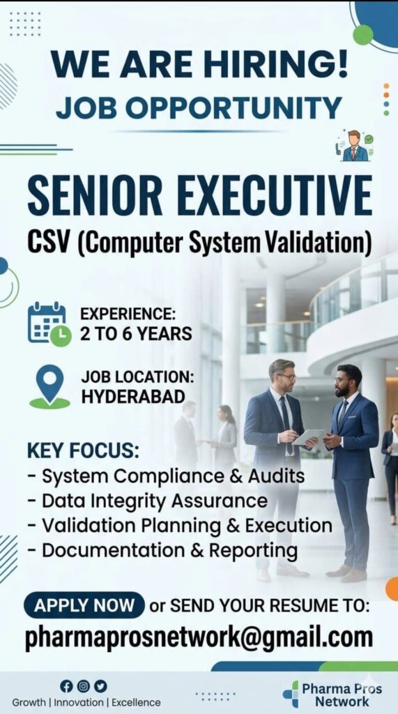 • Senior Executive – CSV (Computer System Validation) – Hyderabad – 2–6 Years Exp – Data Integrity, Audits, Validation Planning