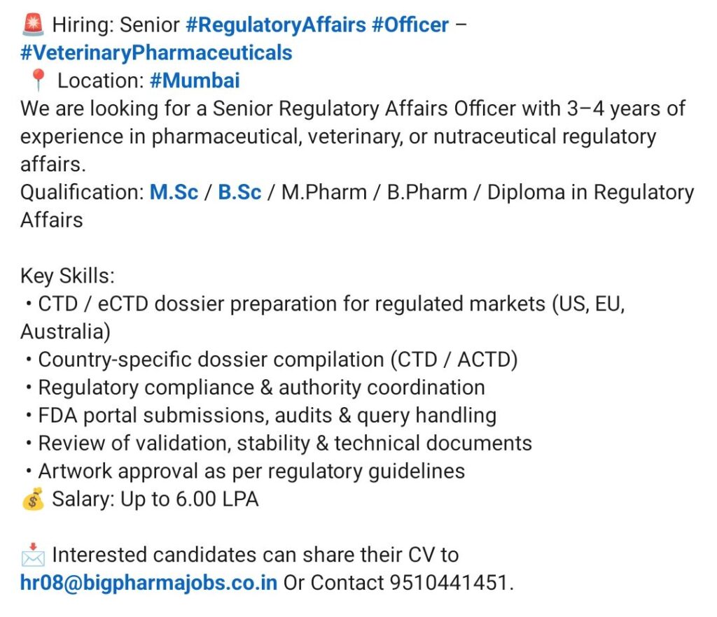 • Senior Regulatory Affairs Officer (Veterinary Pharma) – Mumbai – 3–4 Yrs Exp – CTD/eCTD – Up to ₹6 LPA
