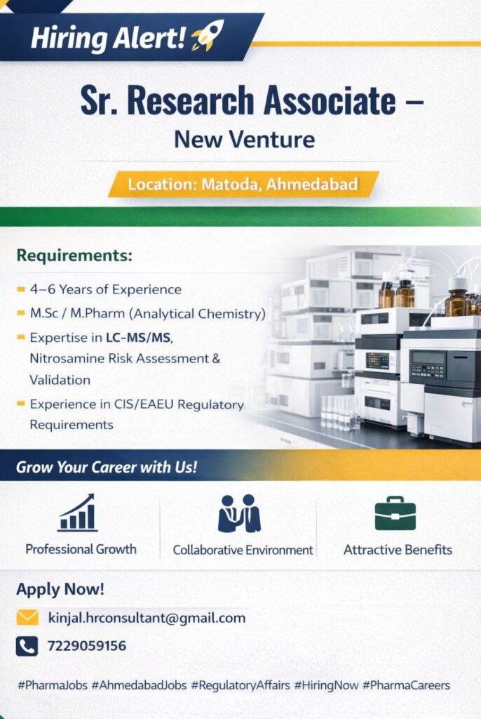 Sr. Research Associate (LC-MS/MS, Nitrosamine Risk Assessment) – Ahmedabad (Matoda) – 4–6 Years Exp – M.Sc / M.Pharm (Analytical Chemistry)