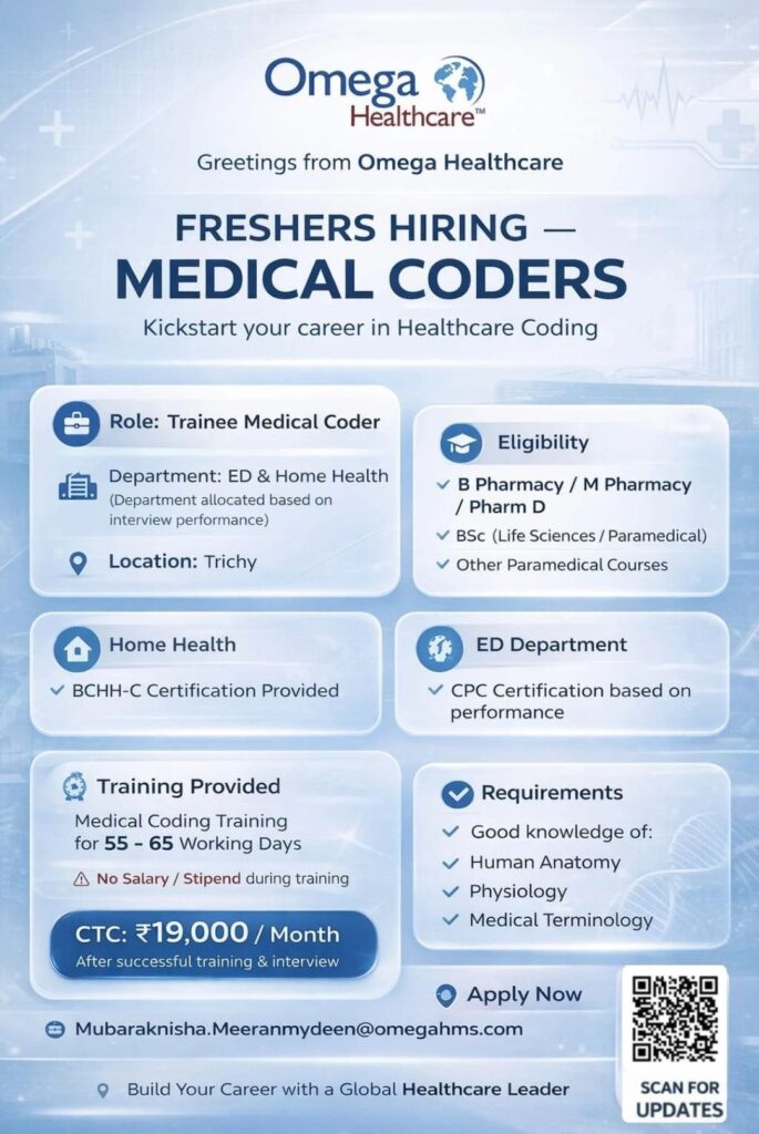 • Trainee Medical Coding Freshers Hiring Trichy – Omega Healthcare (B.Pharm, B.Sc Life Sciences)